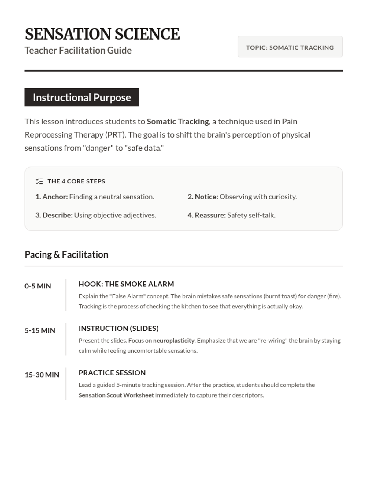 An instructional slide deck for teaching somatic tracking basics, covering the neurobiology of physical sensations and the step-by-step process of mindful observation.