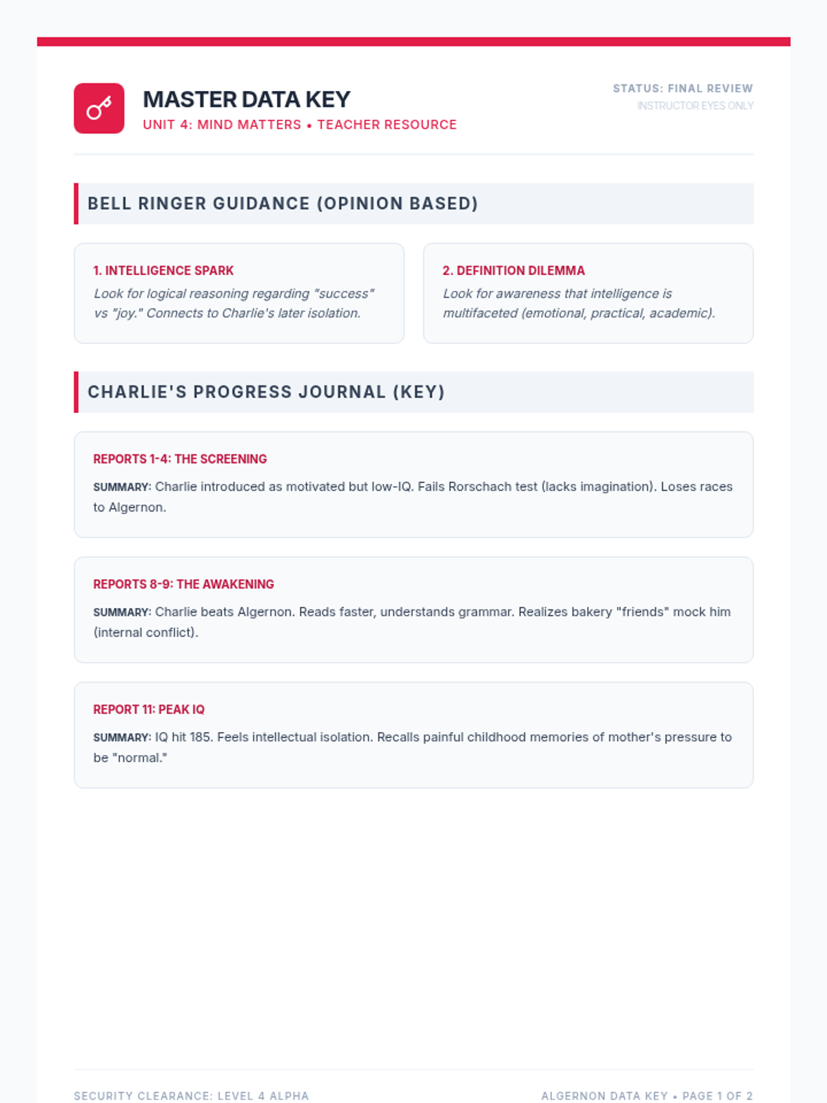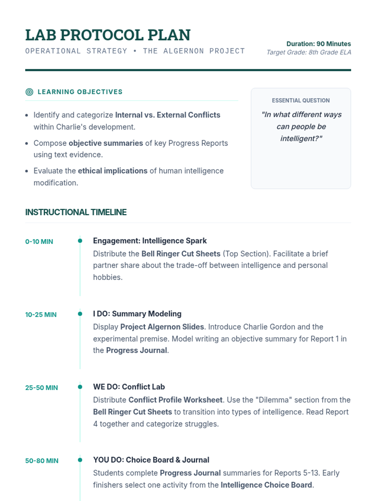 A comprehensive teacher's lesson plan guide for "The Algernon Project," detailing timing, instructional steps, differentiation strategies, and material alignment for an 8th-grade ELA classroom.