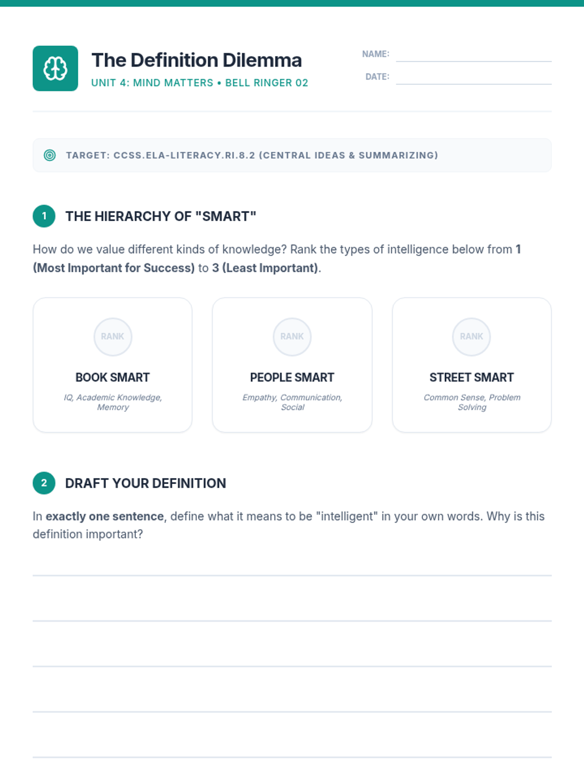 A revised printable student bell ringer for "Flowers for Algernon" that focuses on ranking and defining types of intelligence, updated to remove the text-specific connection question for a broader pre-reading focus.