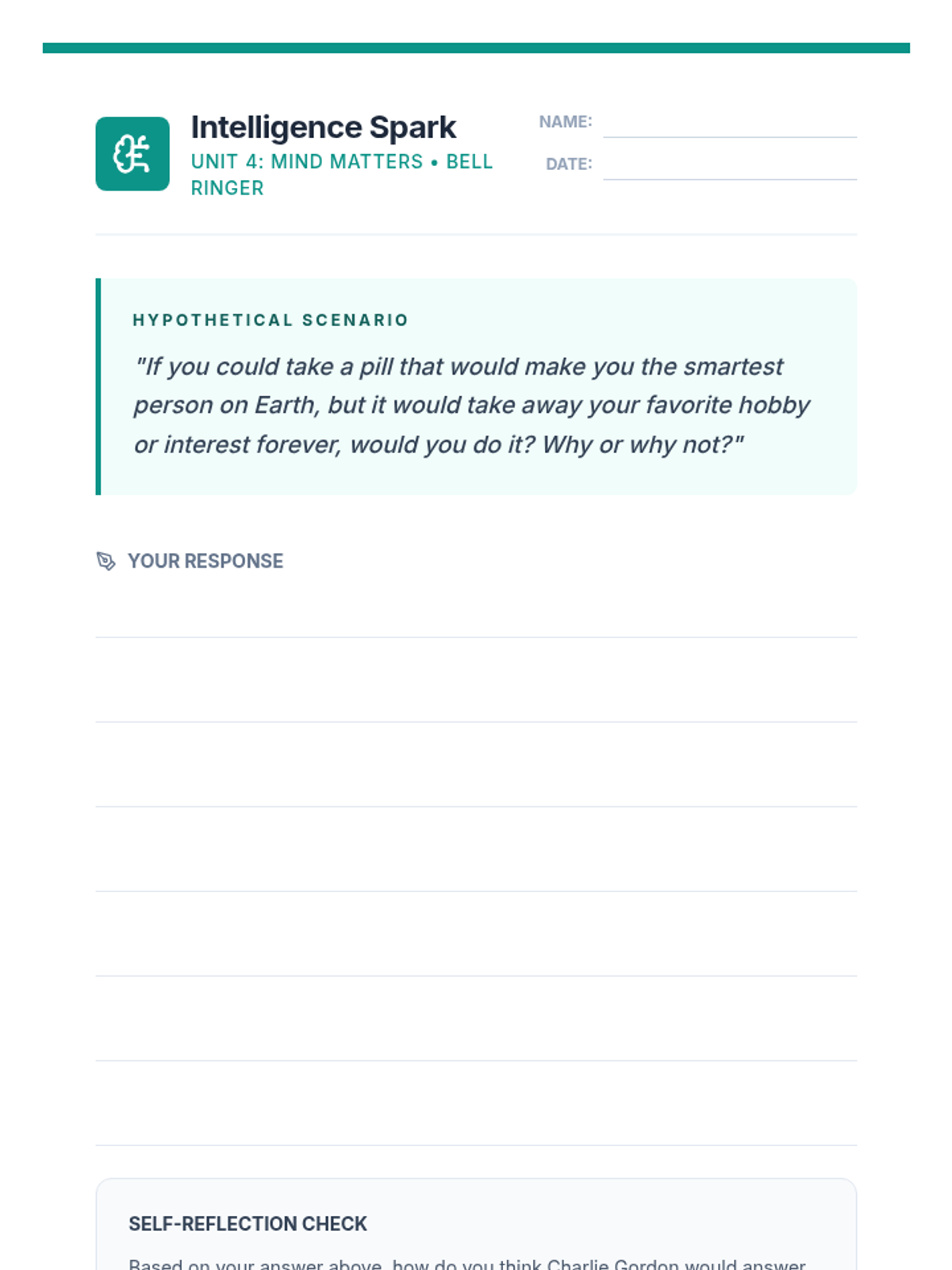 A printable student bell ringer for "Flowers for Algernon" featuring a hypothetical ethics scenario about intelligence and personal sacrifice, designed to prompt pre-reading reflection.