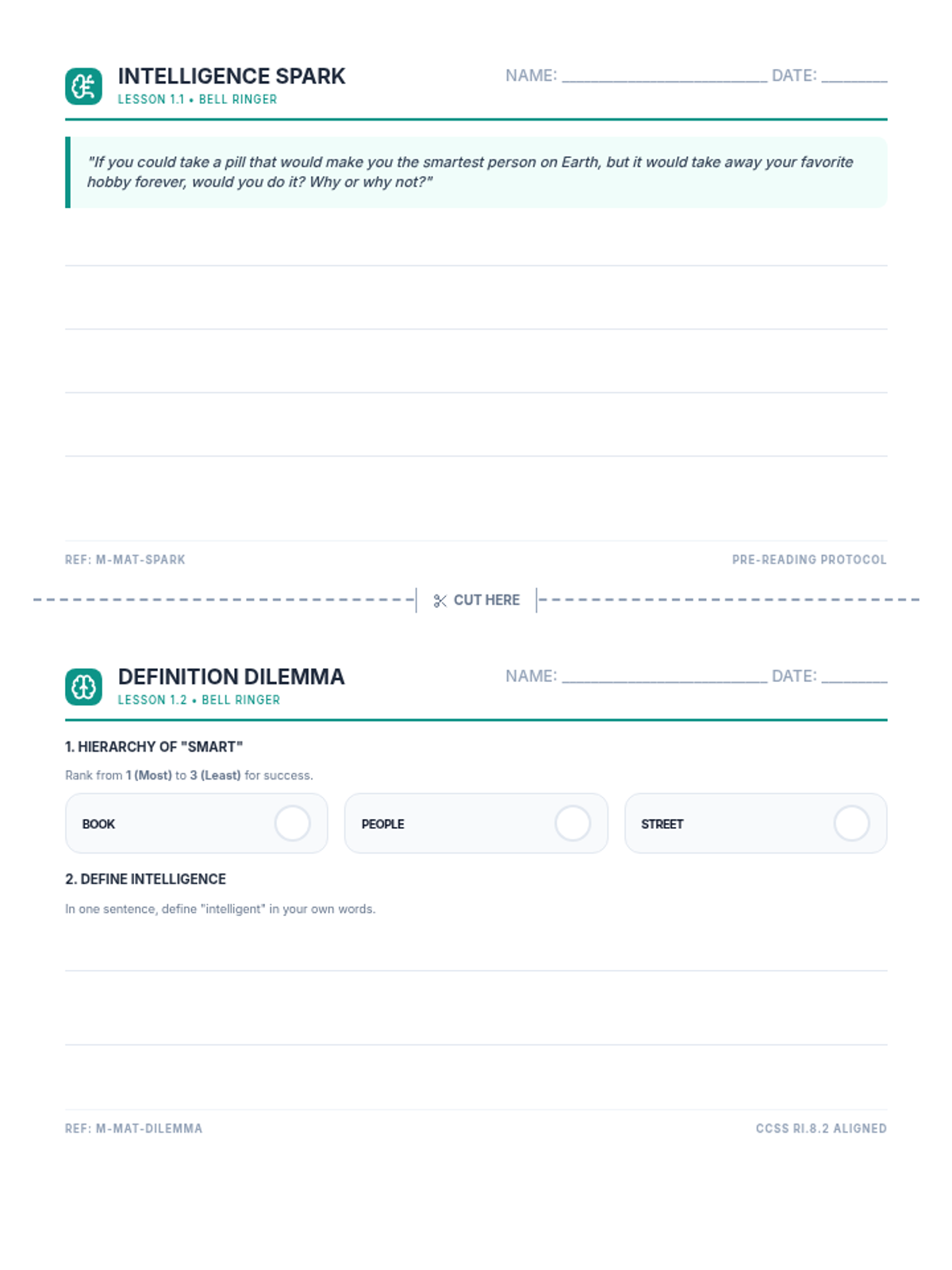 A two-for-one printable document containing both "Intelligence Spark" and "Definition Dilemma" bell ringers on a single 8.5x11 sheet, featuring a dashed cut line for easy classroom distribution.