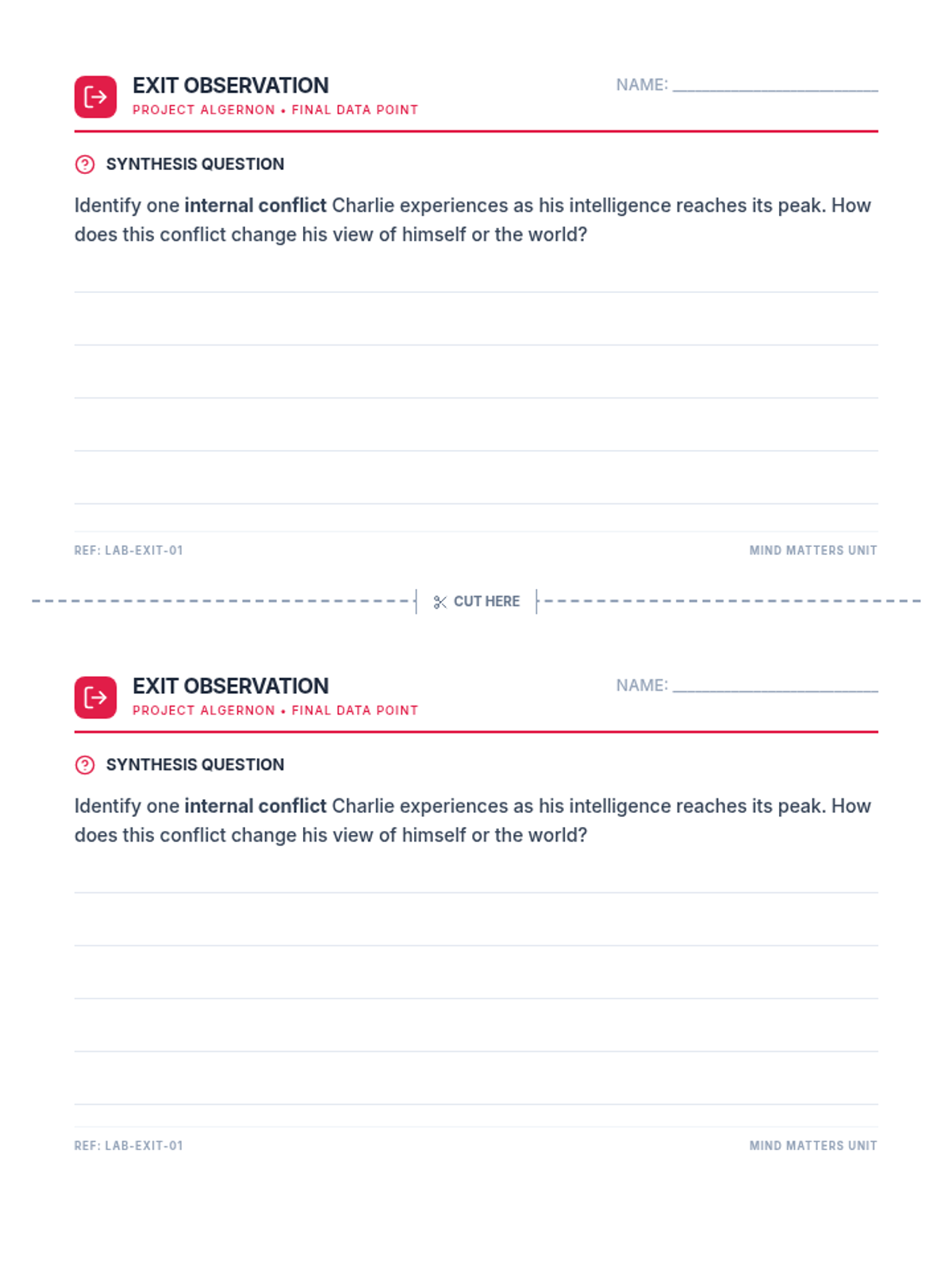 A two-for-one printable exit ticket for "Flowers for Algernon" featuring a single high-level synthesis question about internal conflict, designed for easy cutting and distribution.