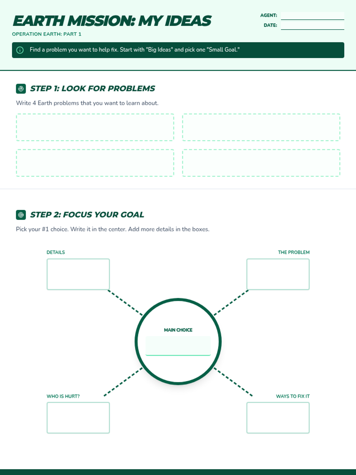 A mission-themed brainstorming worksheet for Operation Earth with simplified language for bilingual students. Scaffolds inquiry from basic facts to 'hard' questions using a question ladder and a central mind map.