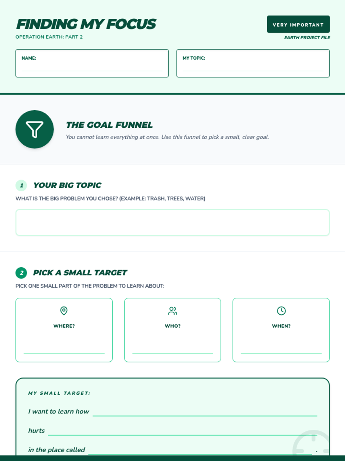 A simplified tactical worksheet to help students narrow their research focus. Uses simple language like 'Where?', 'Who?', and 'Why?' to guide bilingual students through picking a specific research target.