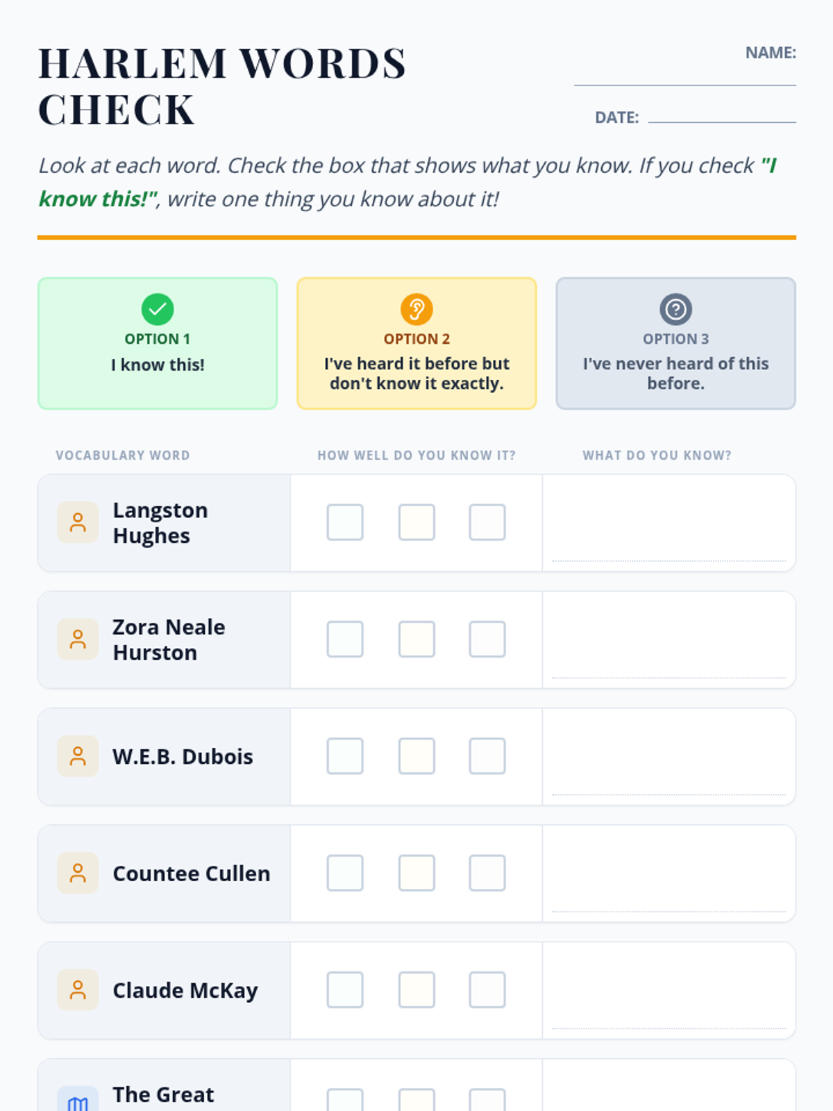 A vocabulary pre-assessment for the Harlem Renaissance unit, designed for middle school students with a 2nd-grade reading level. It features a simple checklist for self-assessment and space for students to write one fact about words they already know.
