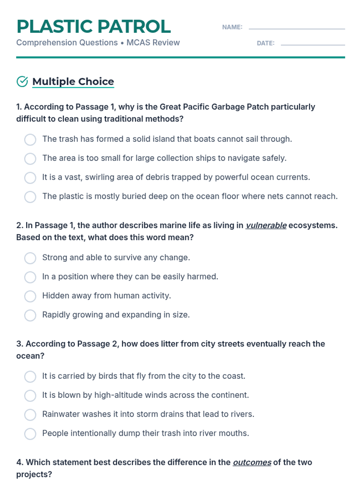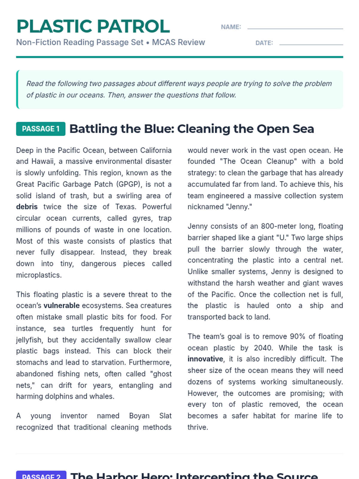 Expanded and more complex 5th-grade level non-fiction passages. Passage 1 details the mechanics of open-ocean cleanup in the Great Pacific Garbage Patch, while Passage 2 explains the strategy of intercepting urban runoff at river mouths.