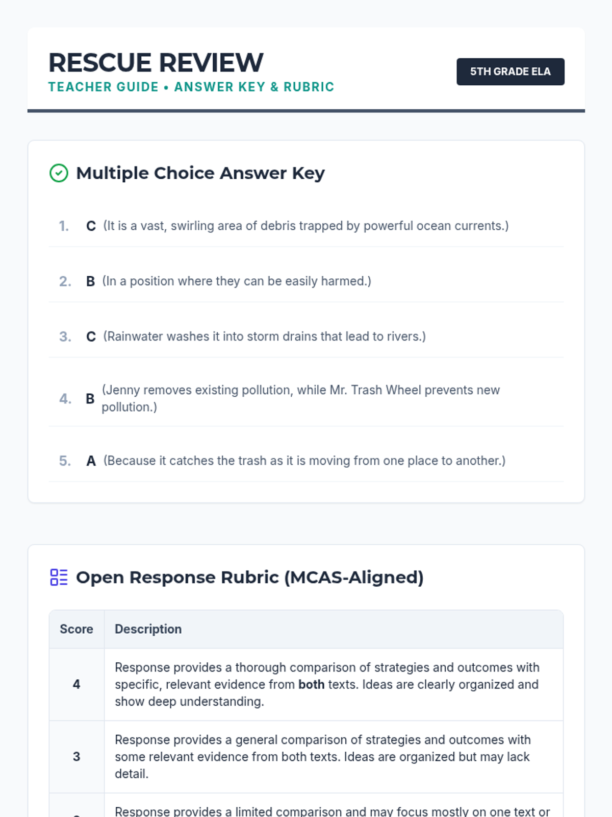 Teacher resource containing the answer key for the multiple-choice questions, a 4-point MCAS-aligned rubric, and a high-quality exemplar response for the open-response question. Updated to reflect 5th-grade Lexile adjustments.
