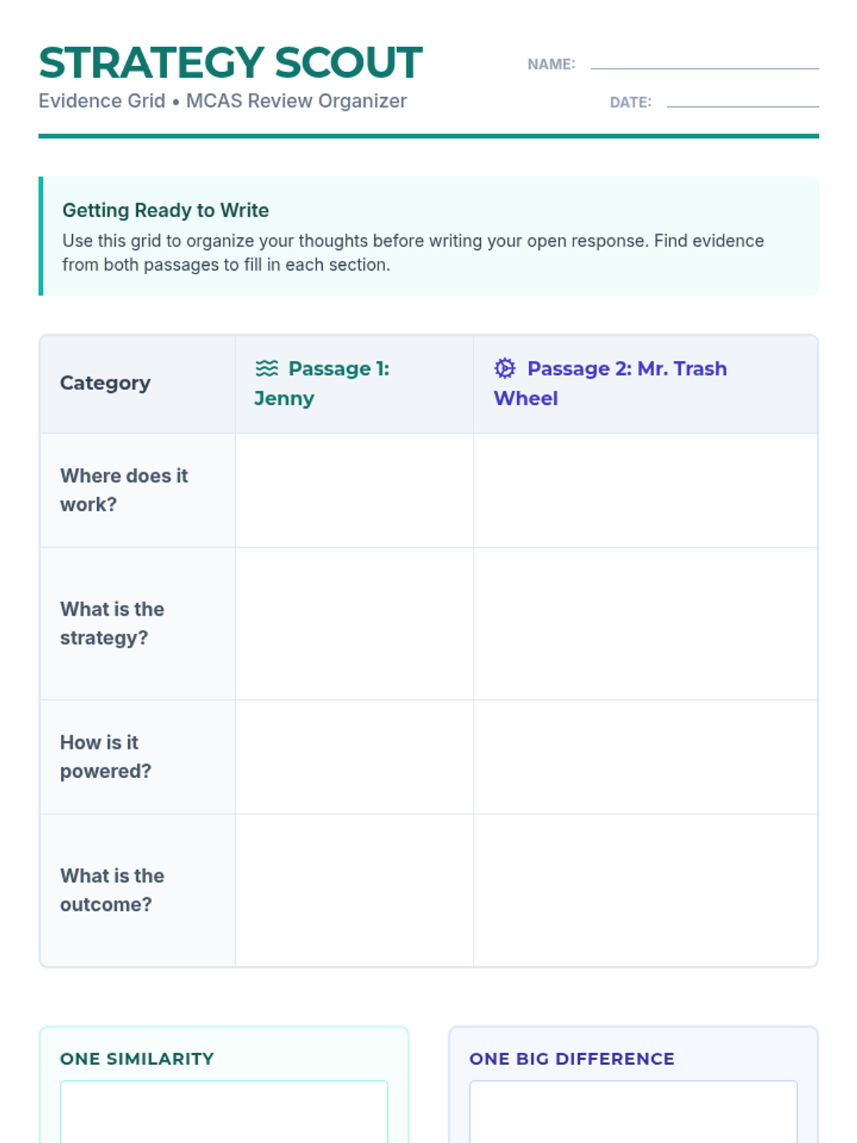 A graphic organizer for students to compare the strategies and outcomes from both passages. It features an evidence grid and sections for identifying similarities and differences.