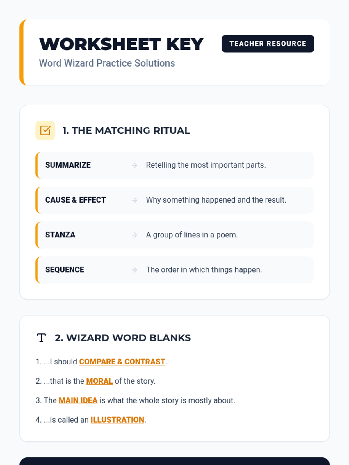 A teacher's answer key for the Word Wizard practice worksheet. Provides clear, bolded answers for matching, sentence completion, and an exemplar response for the short-answer challenge.