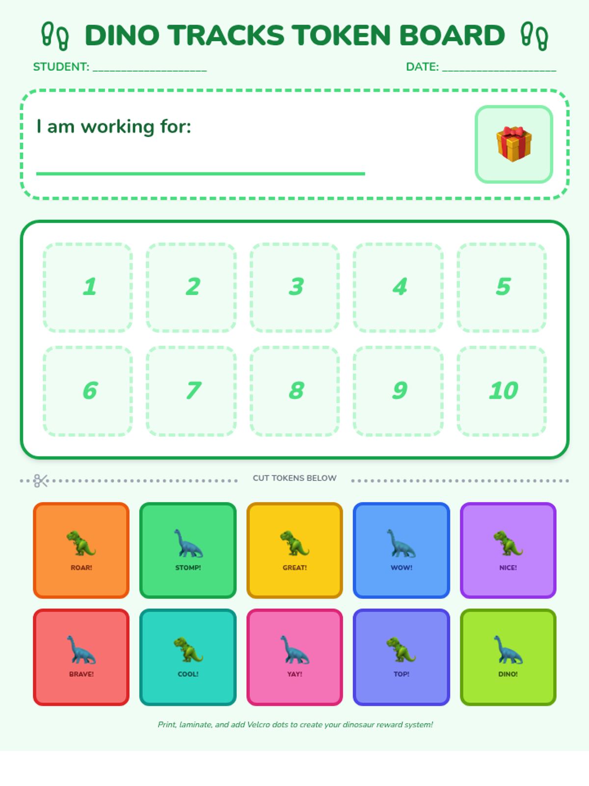 A revised cartoonish dinosaur-themed token board for preschool students. It features 10 square token slots, 10 colorful dinosaur tokens for cutting, and a 'Working For' goal area, all optimized to fit on a single page with high-contrast elements.