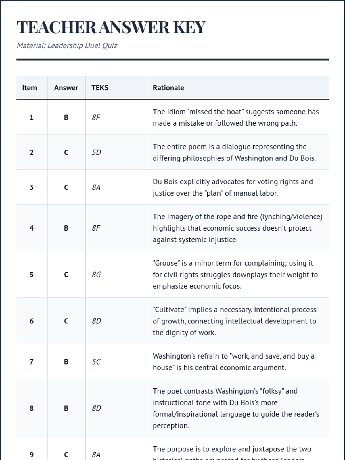 The teacher answer key for the Leadership Duel Quiz, including correct answers, TEKS alignments, and brief rationales for remediation analysis.