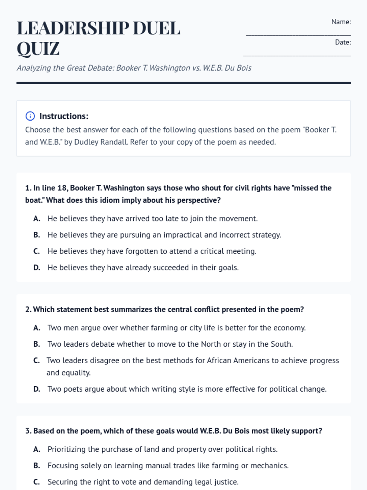 A 10-question multiple-choice remediation quiz designed to help students master the analysis of Dudley Randall's poem 'Booker T. and W.E.B.' focusing on historical perspectives, figurative language, and authorial intent.