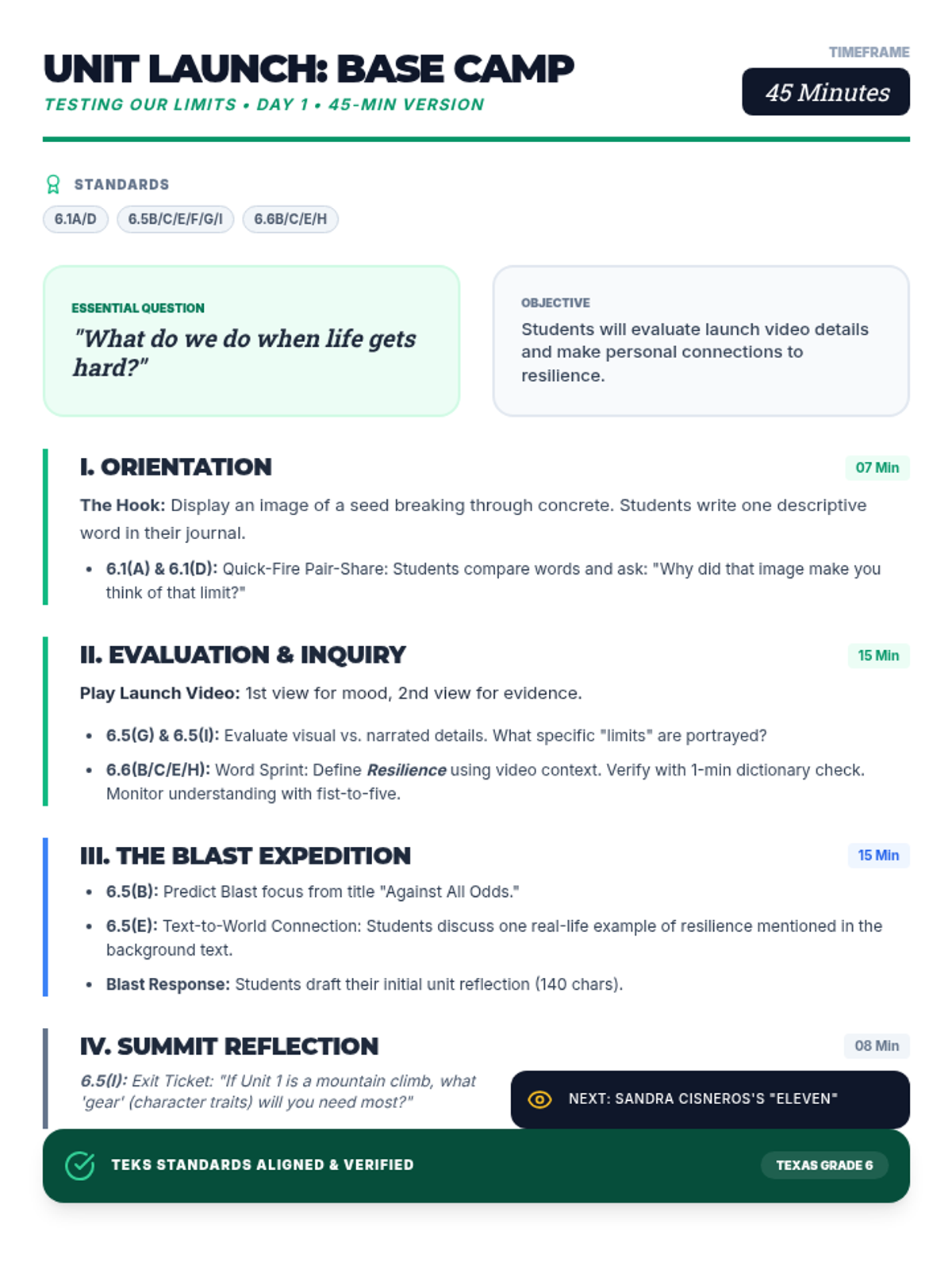 A refined 45-minute lesson plan for Unit 1 Day 1, covering 12 Texas TEKS standards. Streamlined for pace without sacrificing thematic depth or collaborative activities.