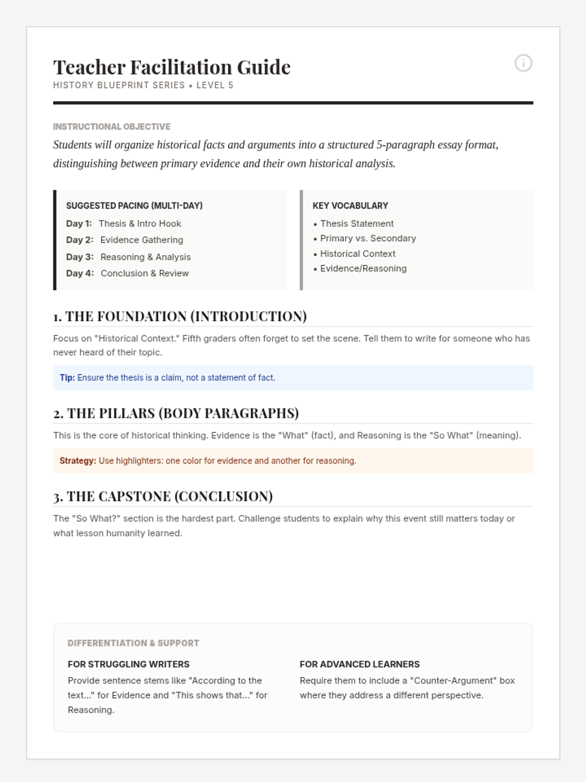 A teacher's facilitation guide for using the History Archive Planner, including pacing suggestions, key vocabulary, section-by-section instructional tips, and differentiation strategies for various learners.
