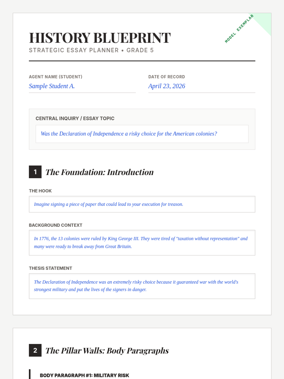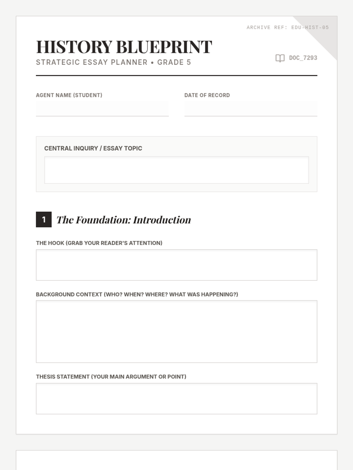A vintage-inspired graphic organizer for 5th-grade students to plan their historical essays, featuring structured boxes for an introduction, three body paragraphs with evidence and reasoning, and a concluding synthesis.