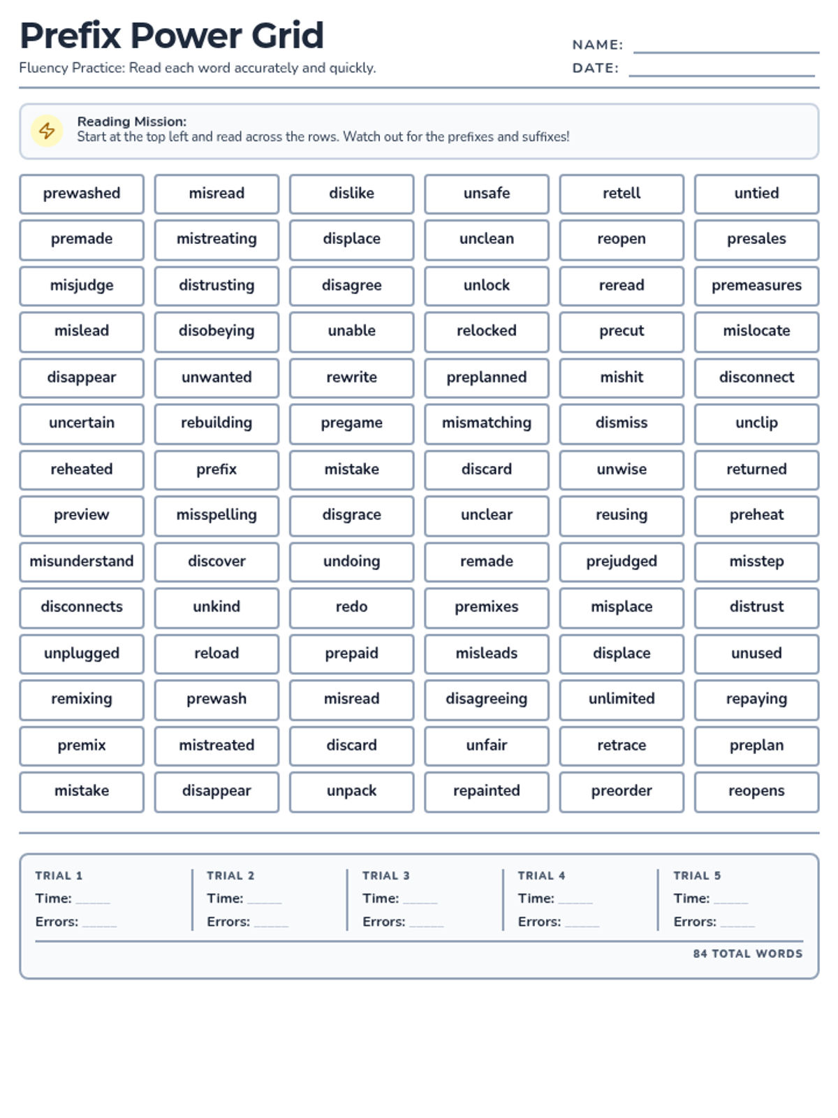 A one-page fluency grid containing 84 words with prefixes (pre-, mis-, dis-, un-, re-) shuffled so no more than two of the same prefix appear consecutively in rows or columns. Approximately 25% of the words include suffixes.