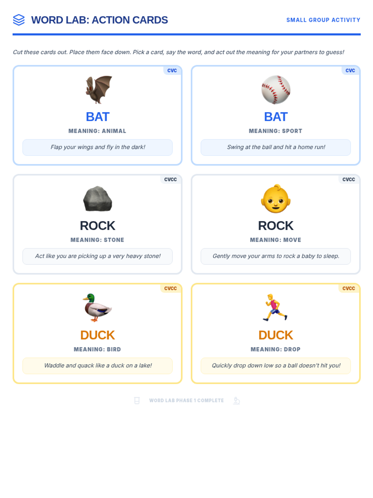 A set of interactive small-group cards for a 'charades' style game. Students act out different meanings of CVC/CVCC words (bat, rock, duck) for their partners to guess. Cards replaced 'bark' (r-controlled) with 'rock' (CVCC) for better phonics alignment.