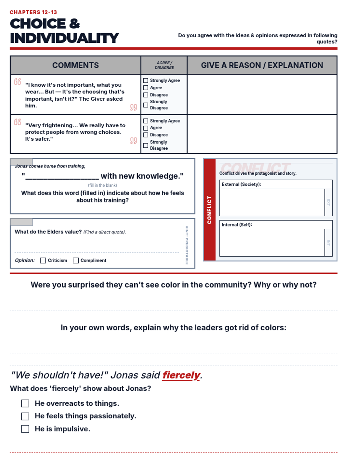 The finalized activity sheet for Chapters 12-13 of The Giver, featuring a red-accented theme, the chapter range prominently displayed in the header, and all previously requested reflection and analysis questions on a single, optimized page.