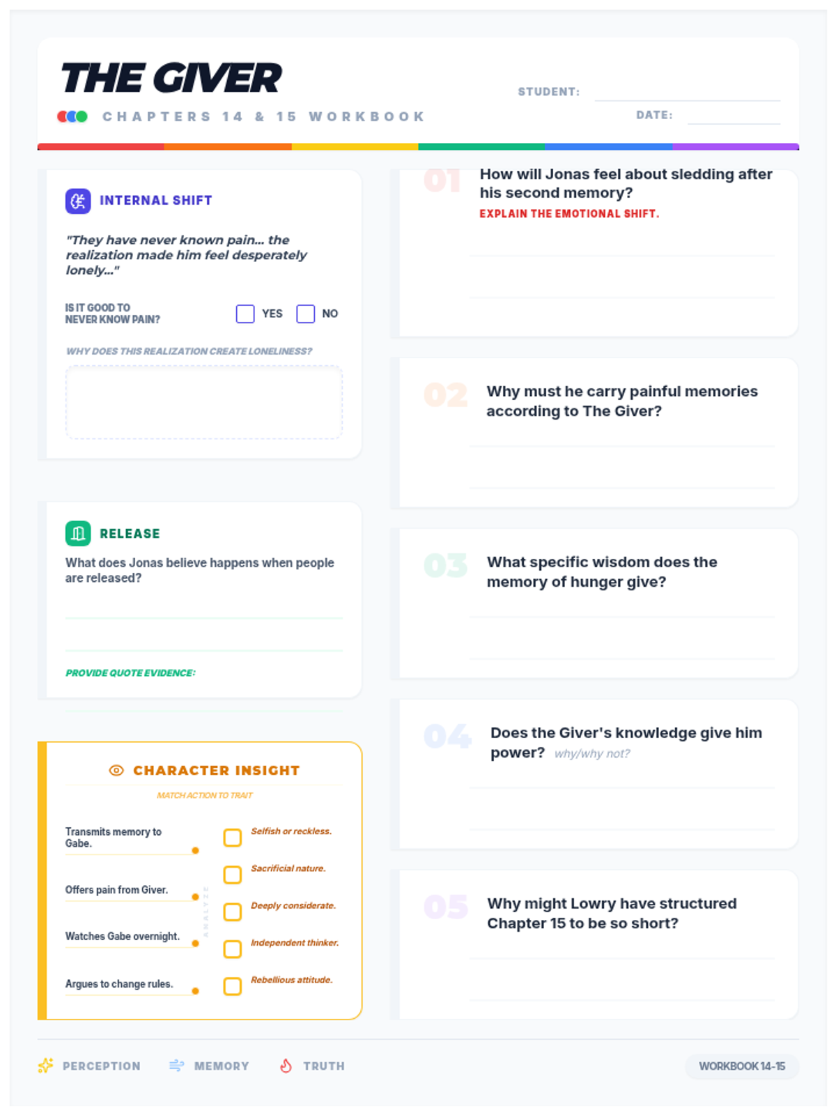 A final, refined one-page workbook for Chapters 14-15 of The Giver. This version has been strictly optimized for height by reducing margins and padding to ensure everything fits perfectly on a single page, while featuring a vibrant full-spectrum rainbow theme to represent Jonas's awakening to color and deep memory.
