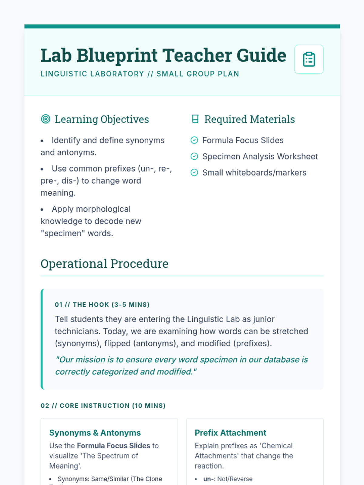 A comprehensive teacher's lesson plan for a small group session on synonyms, antonyms, and prefixes, following a laboratory theme.