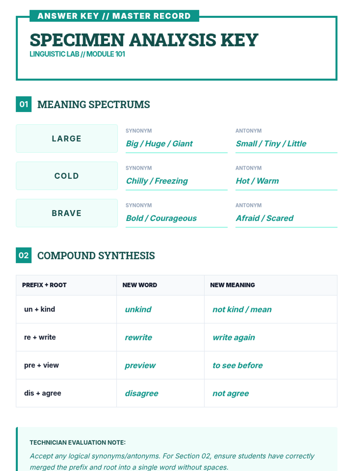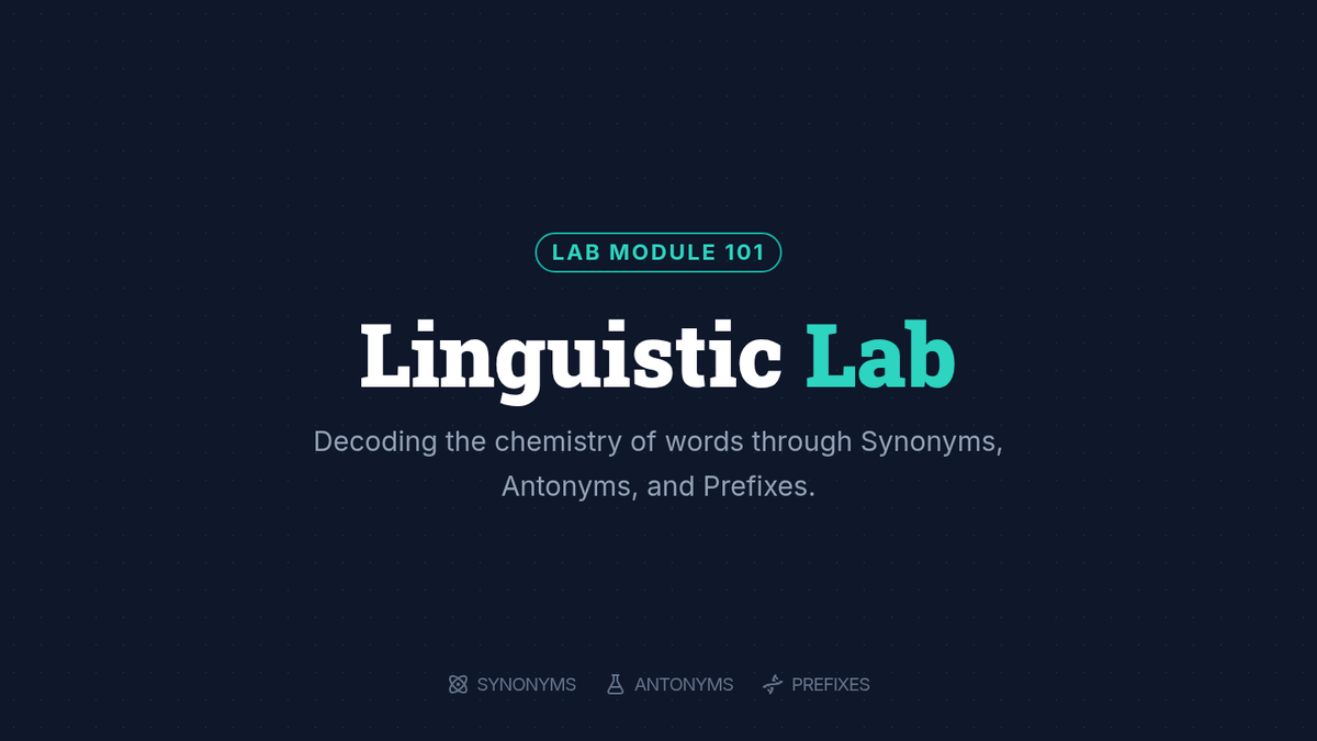 Visual aid for teaching synonyms, antonyms, and prefixes with a modern laboratory theme. Revised for better contrast, consistent line breaks, and text spacing.