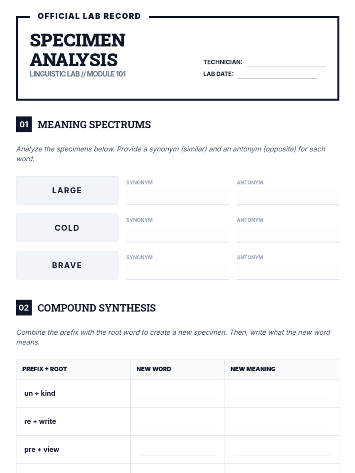 Student worksheet for practicing synonyms, antonyms, and common prefixes with a laboratory investigation theme. Tightened layout to ensure single-page printing and improved writing line contrast.