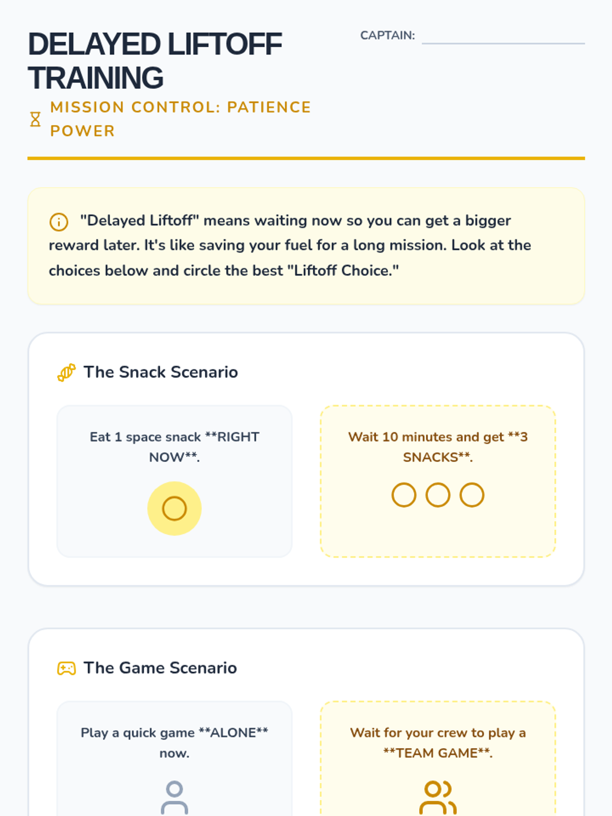A student worksheet focusing on the concept of delaying gratification through scenario-based choices and patience strategy identification.