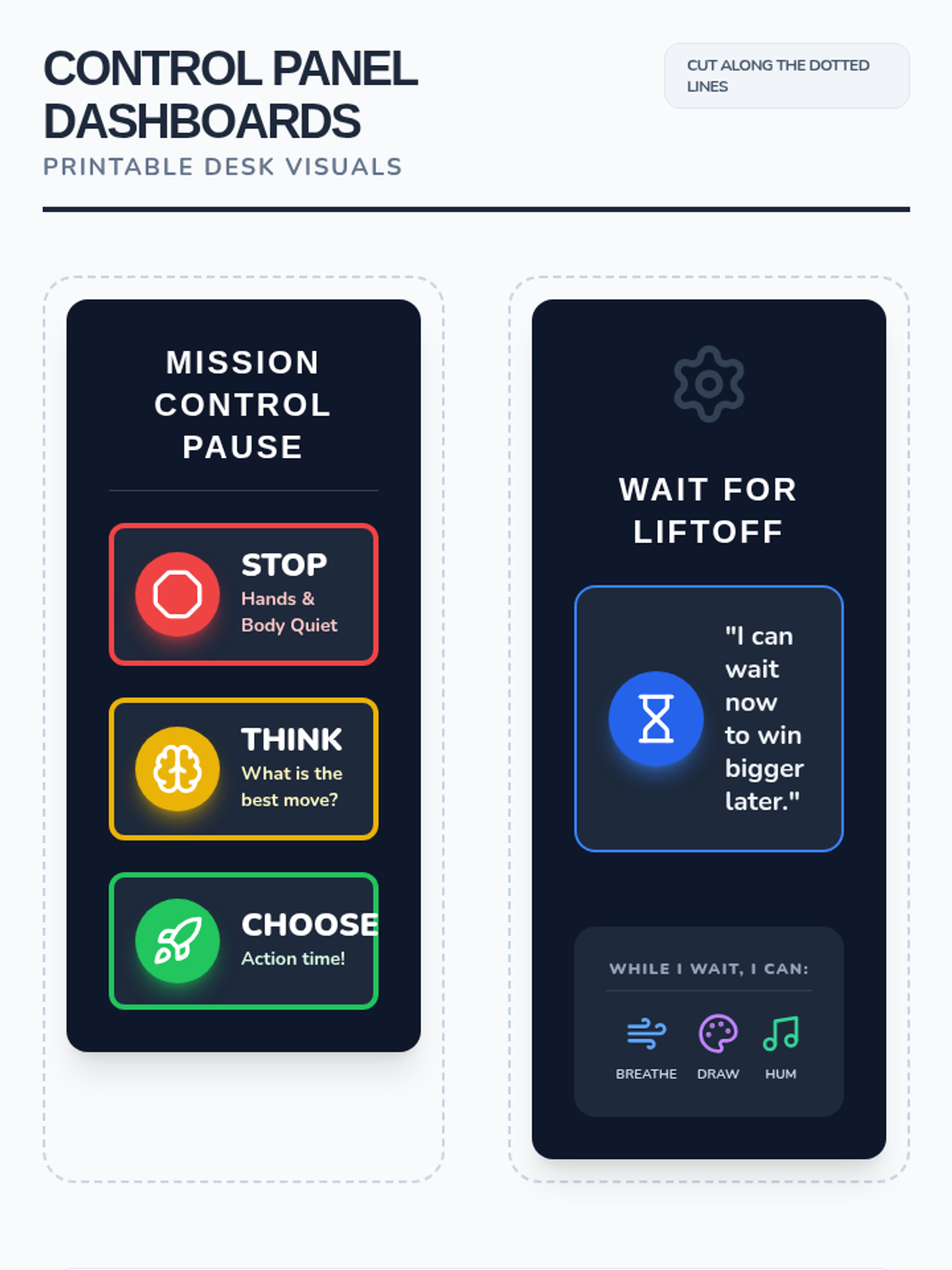 Visual desk cards for students to help them remember to 'Stop and Think' before acting. Includes visual cues for pausing, thinking, and choosing an action. Added icon labels and high-contrast borders for better support.