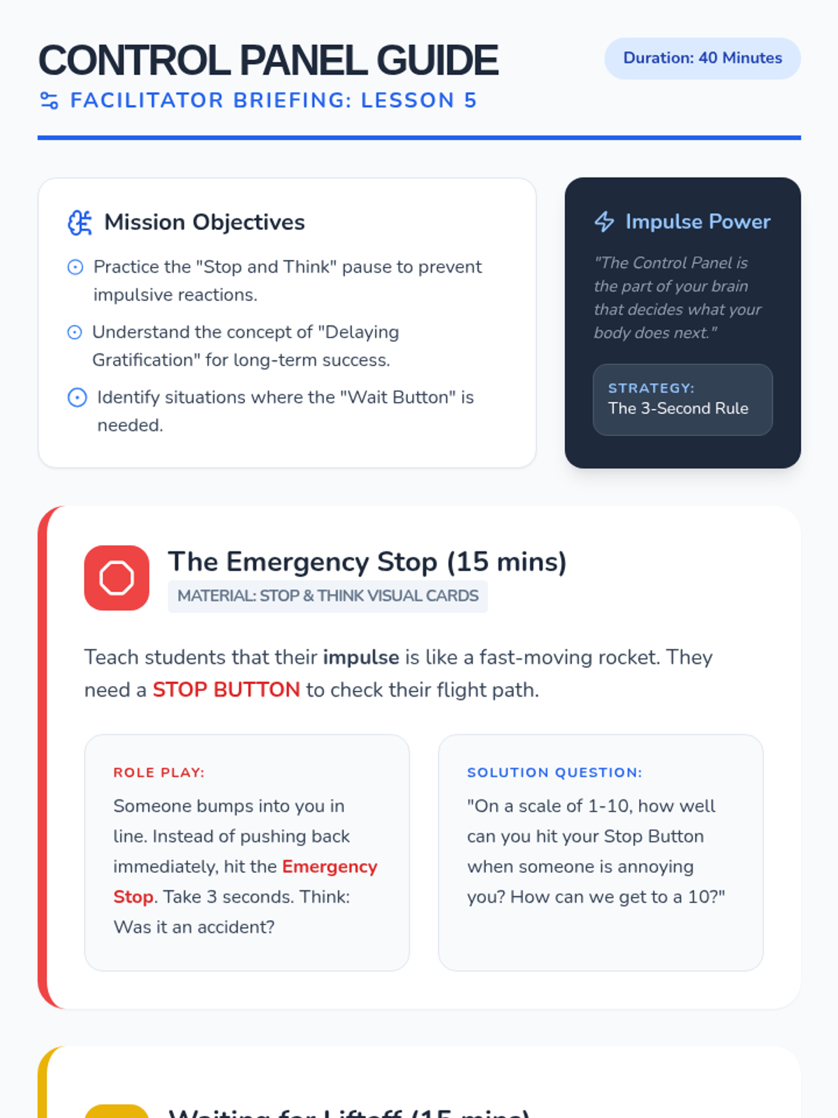 A facilitator guide for the fifth lesson of the curriculum, focusing on 'Stop and Think' techniques and delaying gratification. Fixed page breaks and formatting.