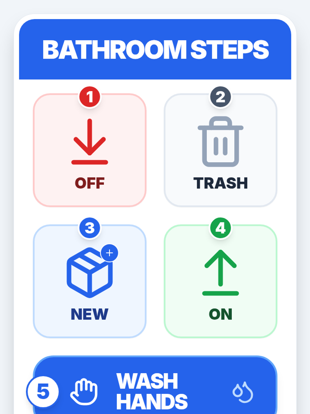 A high-visibility 4-step bathroom guide with extra-wide 1.25-inch margins to ensure zero cutoff on any home printer. Features large icons and high-contrast text for seniors.