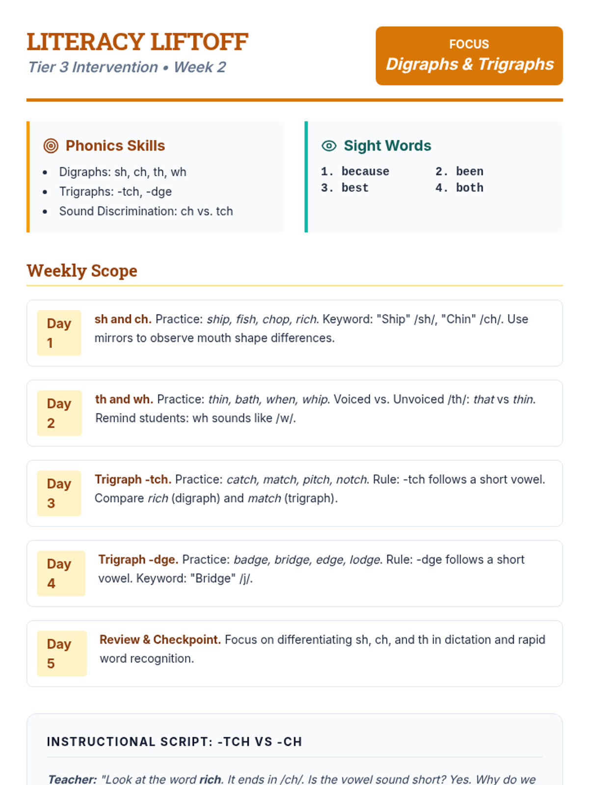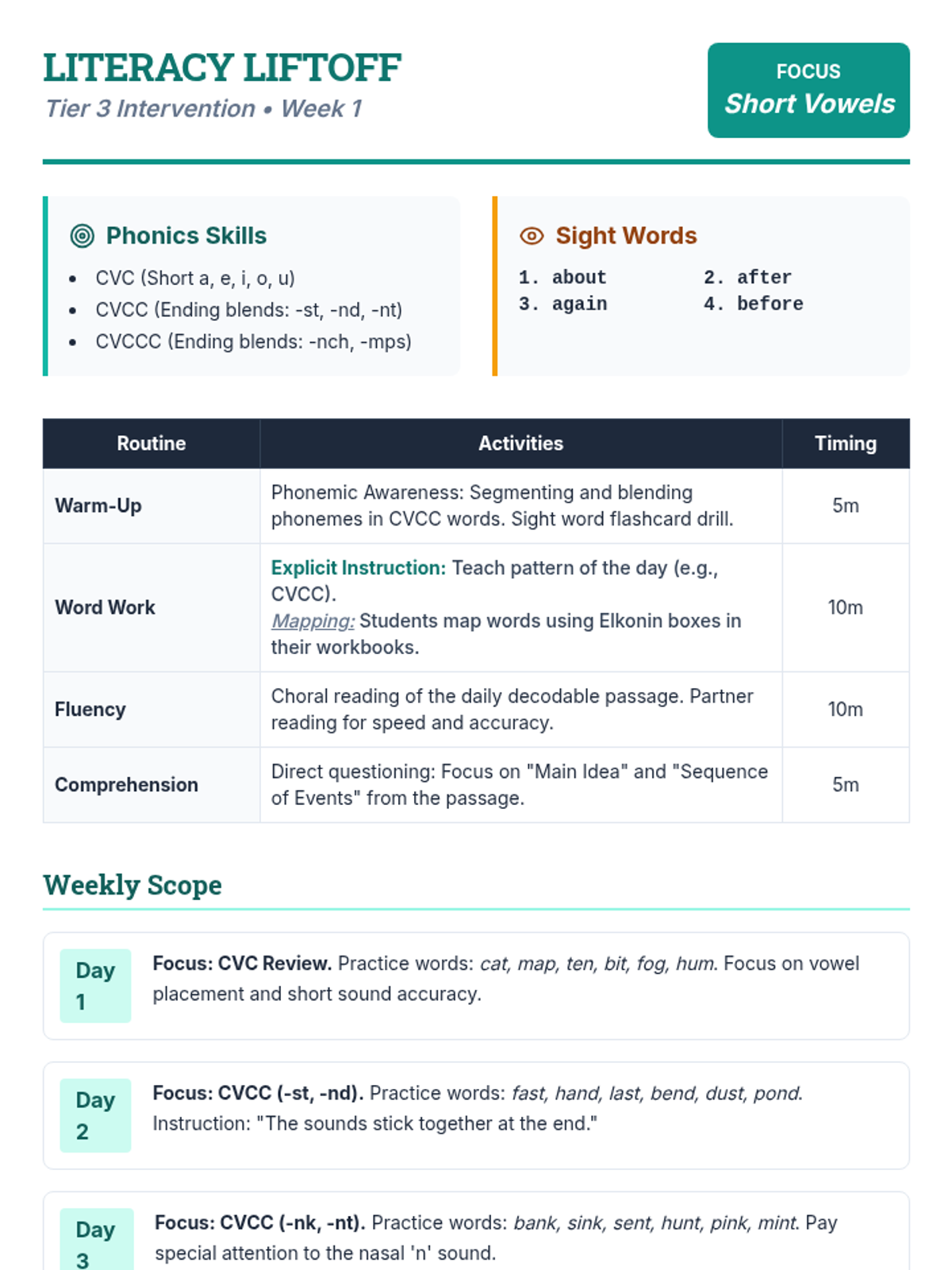 A comprehensive 5-day instructional guide for teachers, focusing on short vowel CVC, CVCC, and CVCCC patterns. Includes daily lesson breakdowns, scripted teaching tips, and sight word lists for Tier 3 intervention.
