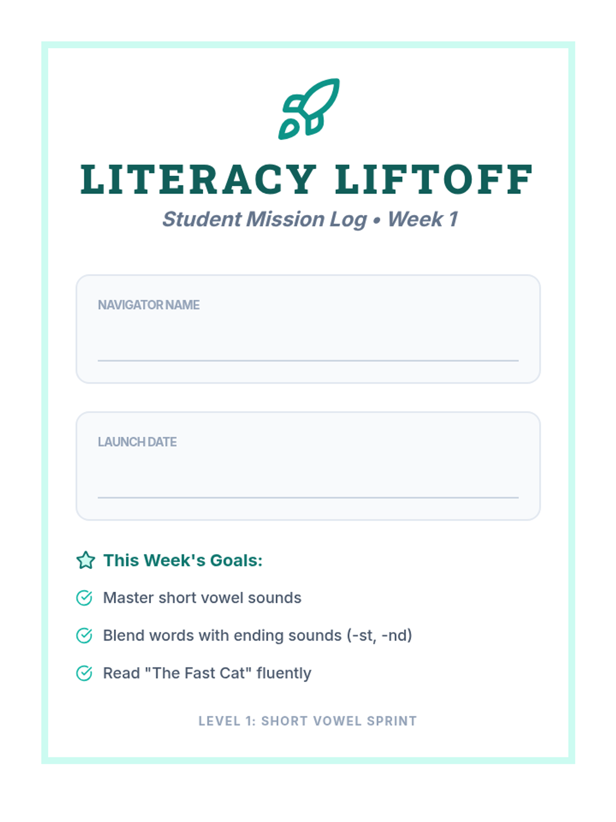 A student-facing workbook for Week 1, including a mission-themed cover, orthographic mapping boxes for CVC and CVCC words, and a decodable passage with comprehension questions.