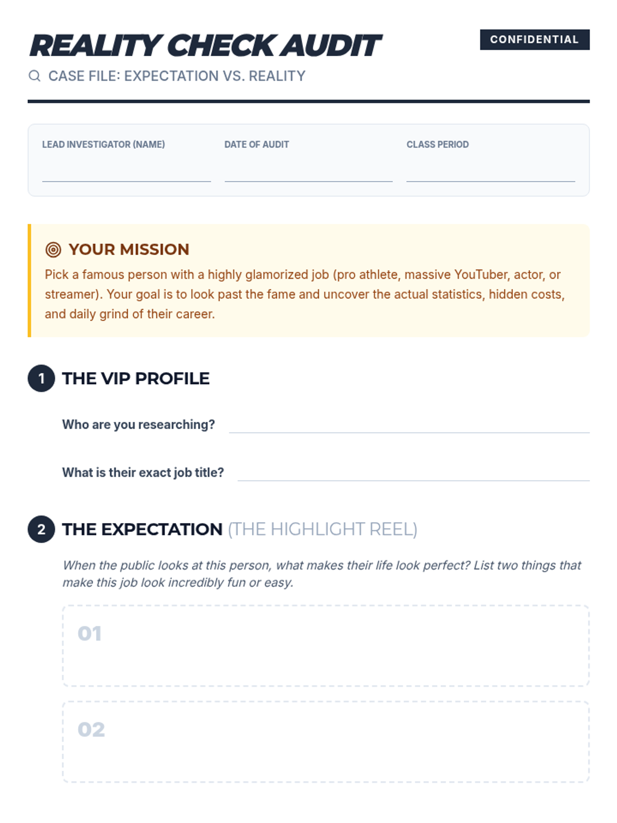 A career exploration worksheet that guides students through researching the reality of glamorized celebrity jobs, focusing on success rates, career longevity, and hidden expenses.