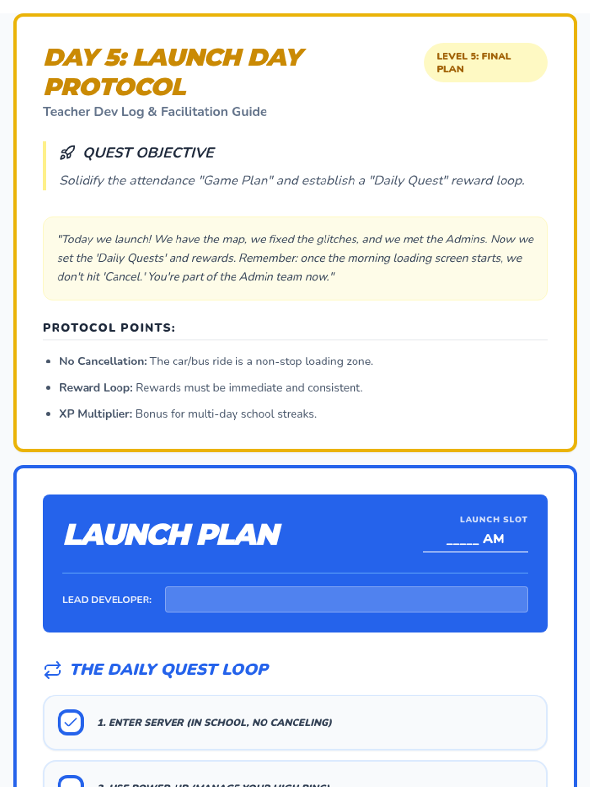 Day 5 materials for the final 'Launch Day Protocol.' This includes a 'Game Plan' for school attendance, daily quest objectives, a reward system ('Loot Box'), and a formal 'Server Access Agreement' to solidify the commitment.
