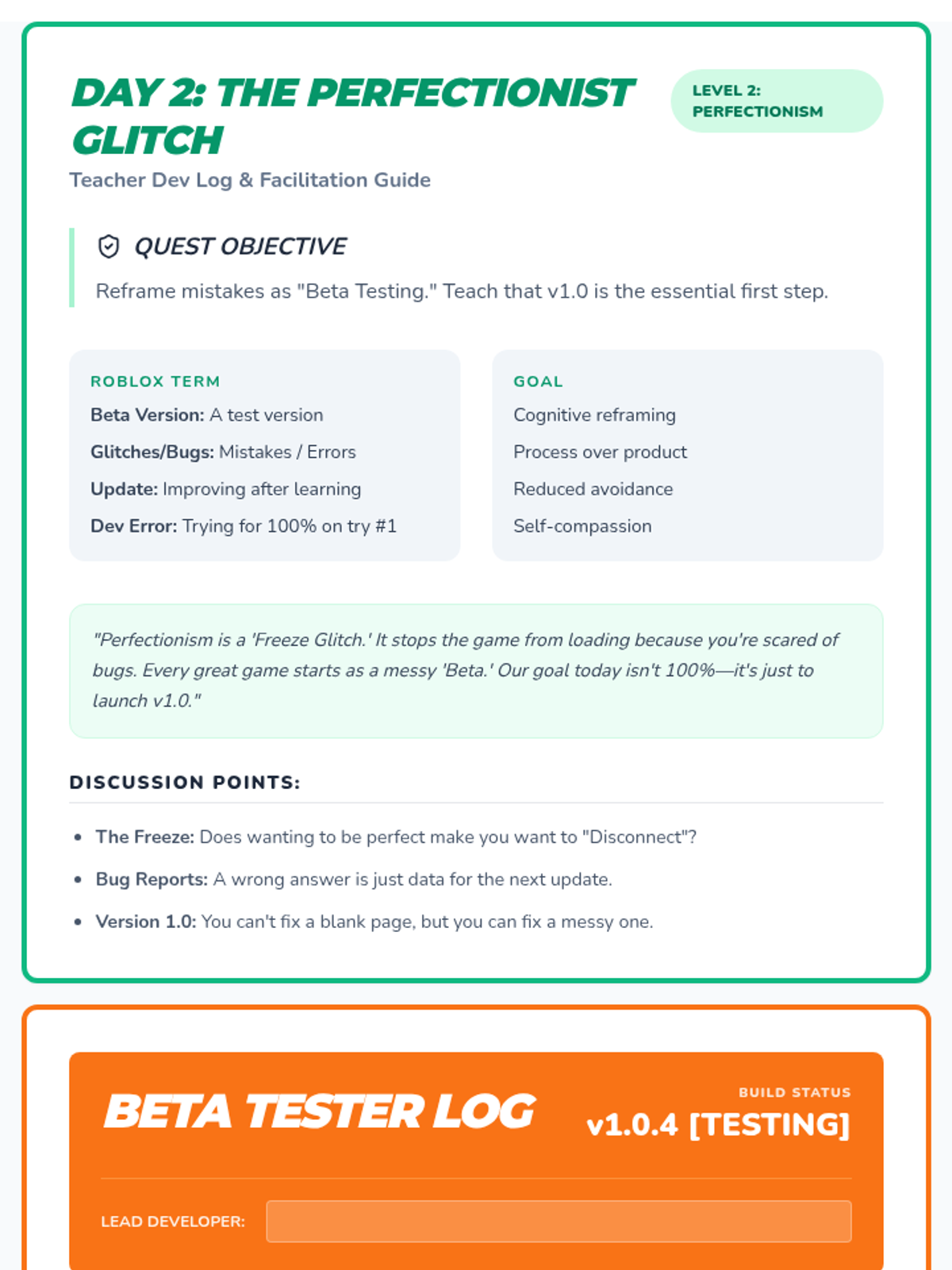 Day 2 materials focused on perfectionism. The teacher guide and student worksheet frame mistakes as 'Beta Testing' and 'Bugs' to be patched, reducing the pressure to be perfect and encouraging 'Version 1.0' (getting started).