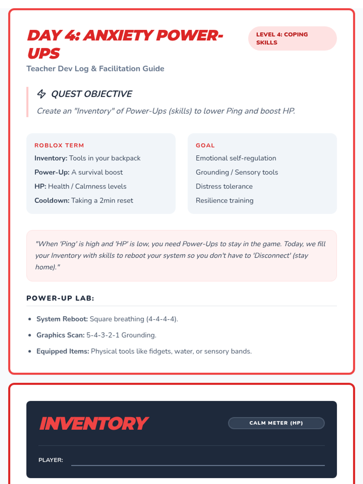 Day 4 materials focusing on coping skills. The student builds an 'Inventory' of 'Power-Ups' (breathing, grounding, sensory tools) to manage anxiety symptoms during the school day.