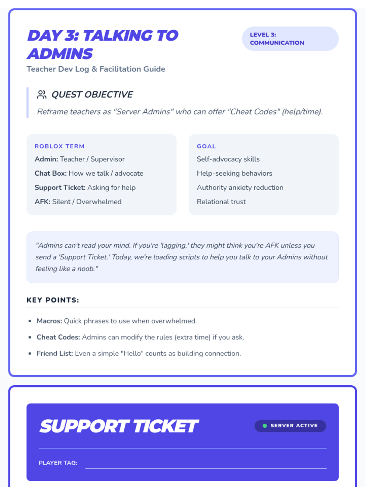 Day 3 materials focusing on teacher engagement. Reframes teachers as 'Server Admins' and provides 'Chat Box Macros' (scripts) for the student to use when feeling overwhelmed or stuck.