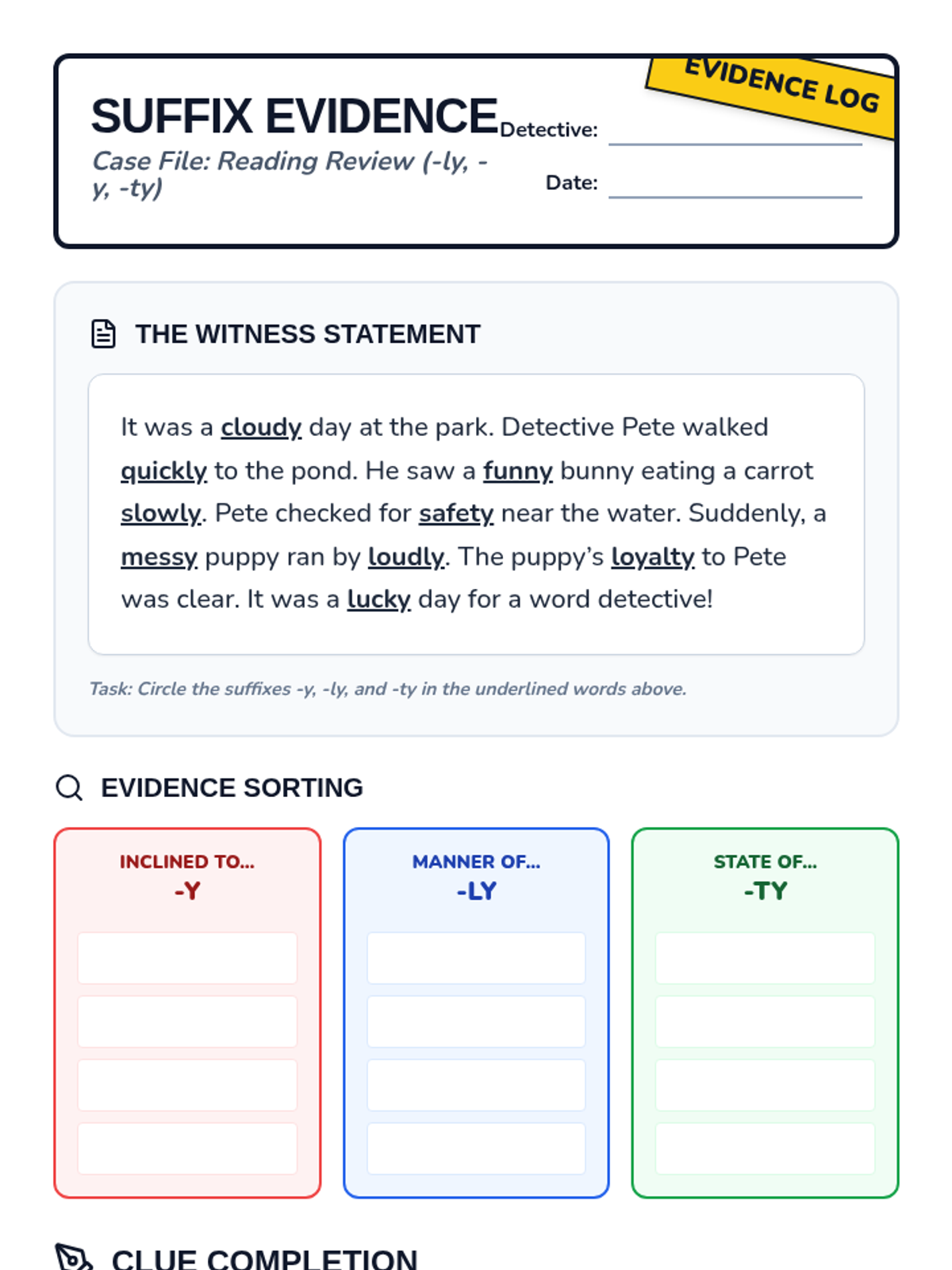 A student-facing worksheet designed to be used alongside the Clue Finder Slides. Includes trick word tracing, missing letter puzzles, a suffix decoder for -ly, -y, and -ty, word sorting, and sentence dictation. Re-designed for optimal handwriting space and layout.