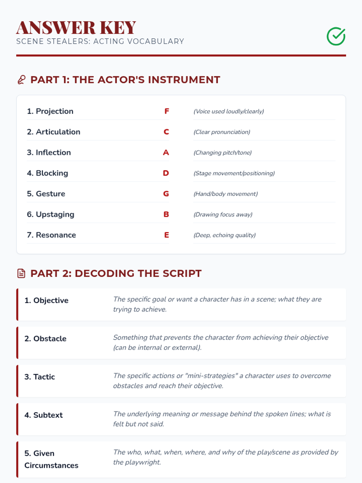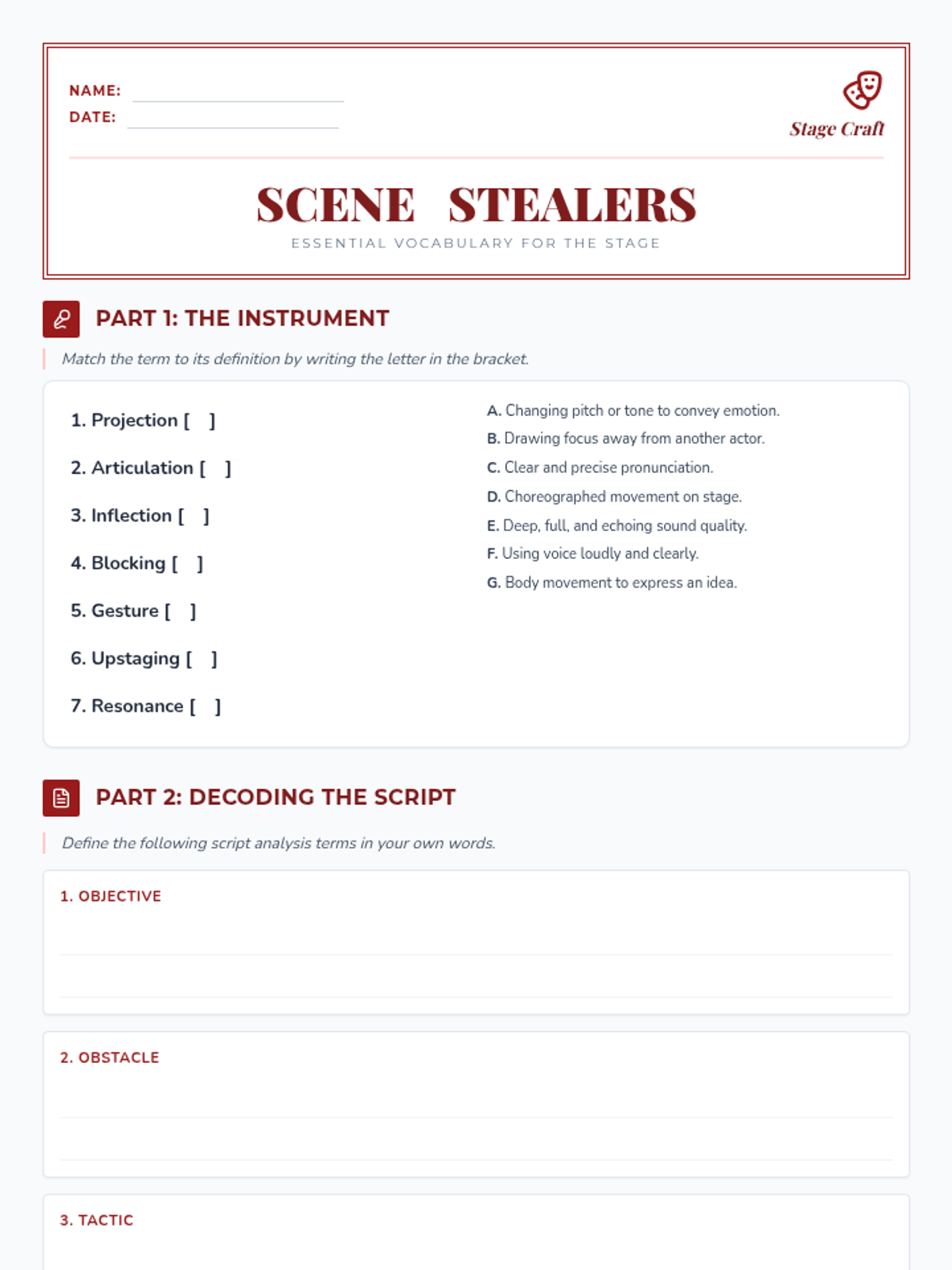 A visually engaging theater-themed worksheet covering essential vocabulary for vocal expression, physical movement, and script analysis. Includes matching exercises, definition sections, and a practical scenario-based application.