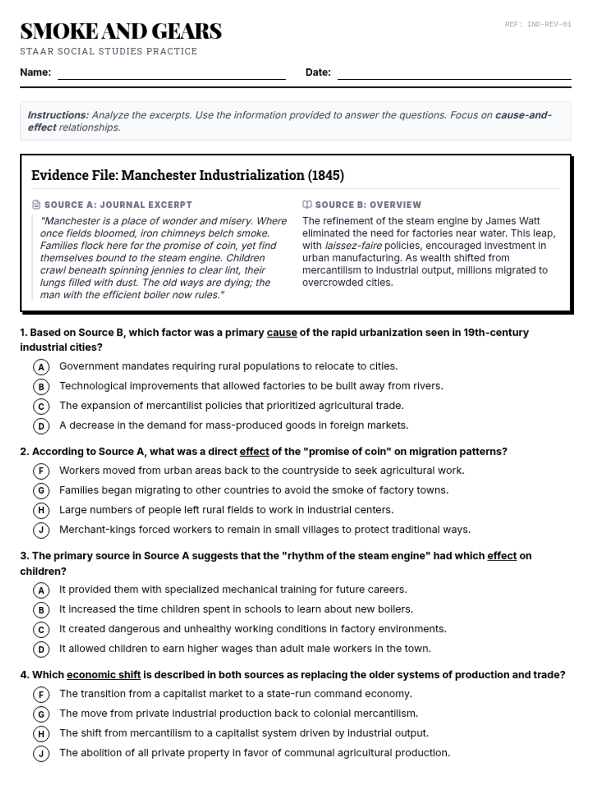 A single-page, 4-question STAAR-style practice worksheet on the Industrial Revolution. Highly optimized for 8.5x11 printing with `break-inside-avoid` to ensure each question and its answers stay together.