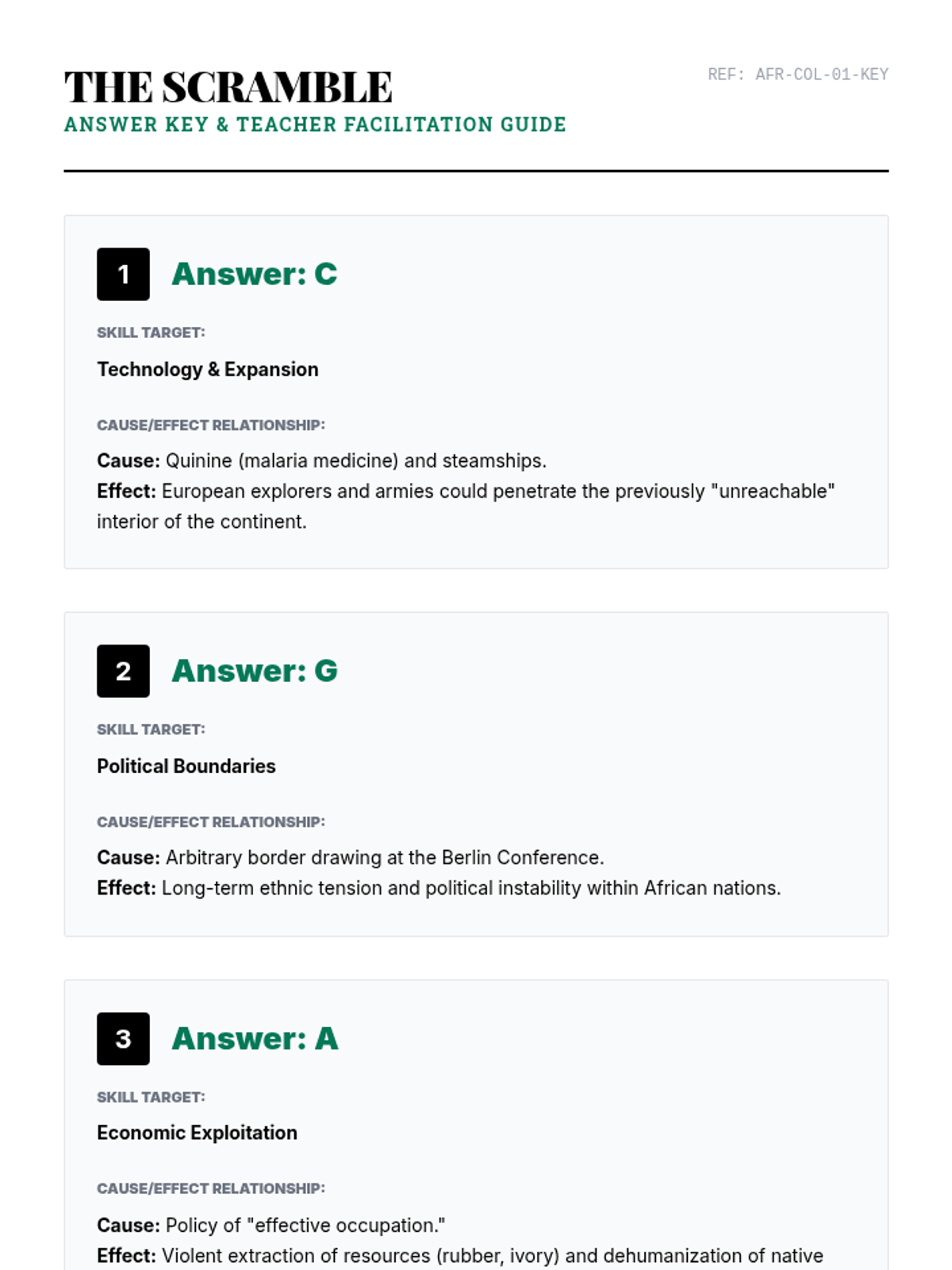 A detailed teacher answer key and facilitation guide for the colonization of Africa worksheet. It provides correct answers, cause-and-effect breakdowns, and instructional insights.