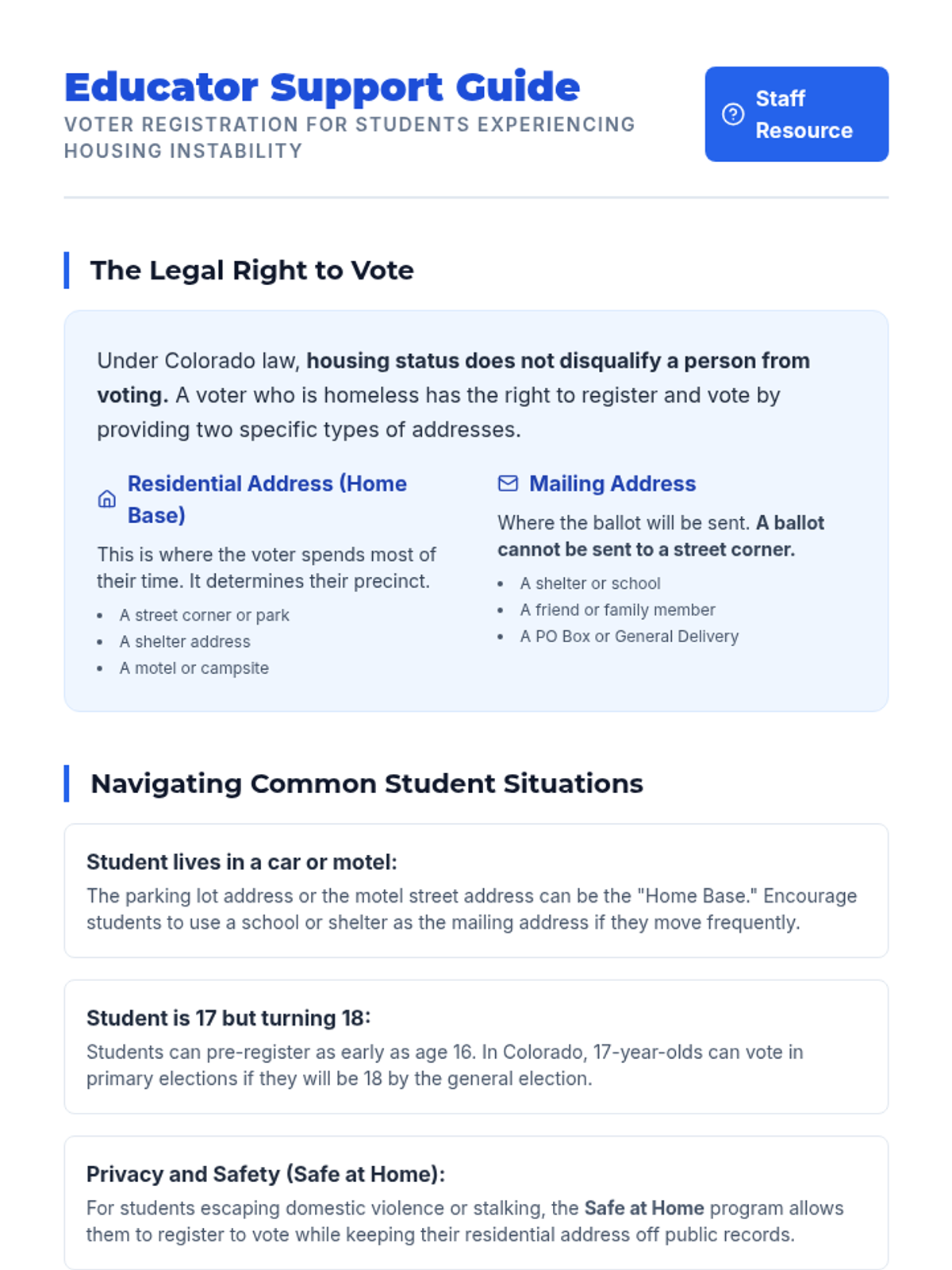 A professional guidance document for educators and support staff to assist students experiencing housing instability with voter registration in Colorado, including legal rights and practical strategies.