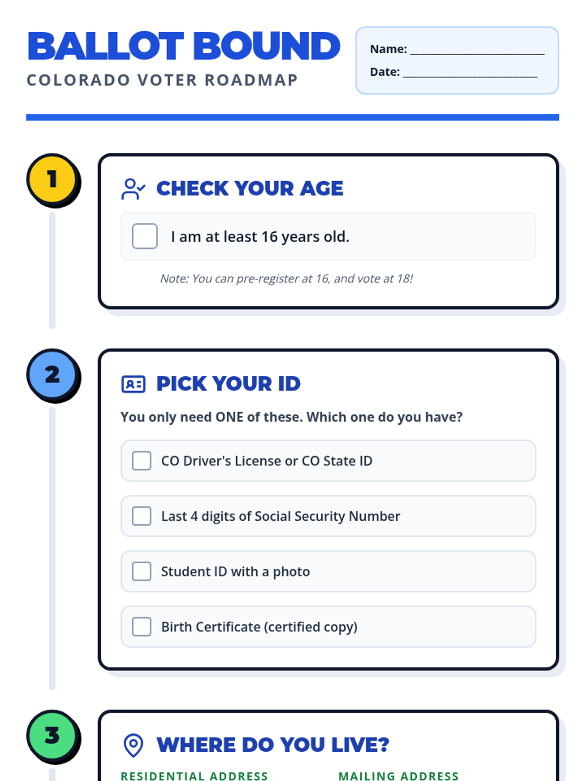 An updated, high-contrast visual roadmap for voter registration in Colorado, optimized for neurodiverse high school students experiencing housing instability. Features a clear vertical flow with checkbox-style options.