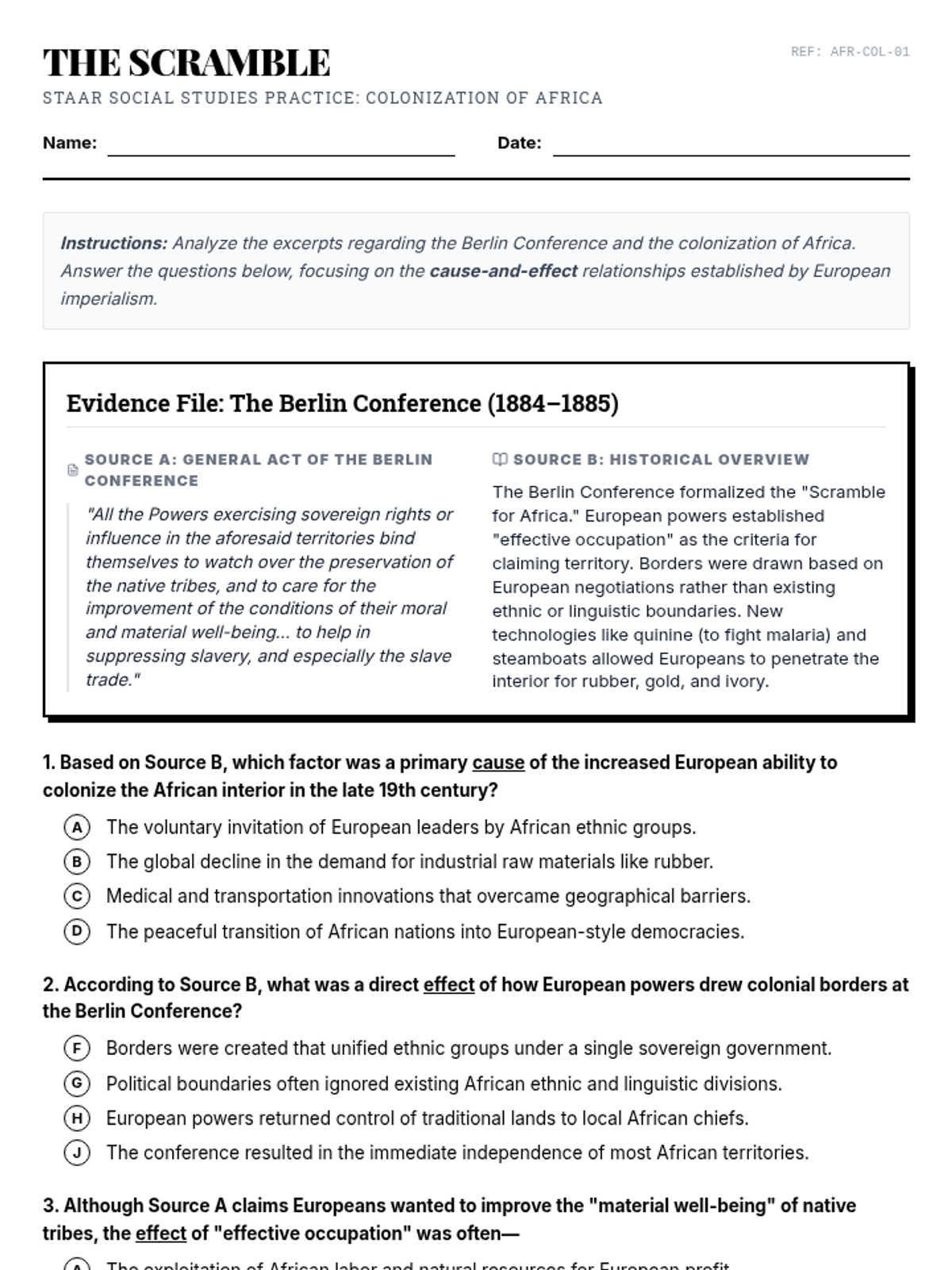 A single-page, 4-question STAAR-style practice worksheet on the colonization of Africa. It includes `break-inside-avoid` to ensure each question and its answers stay together during printing.
