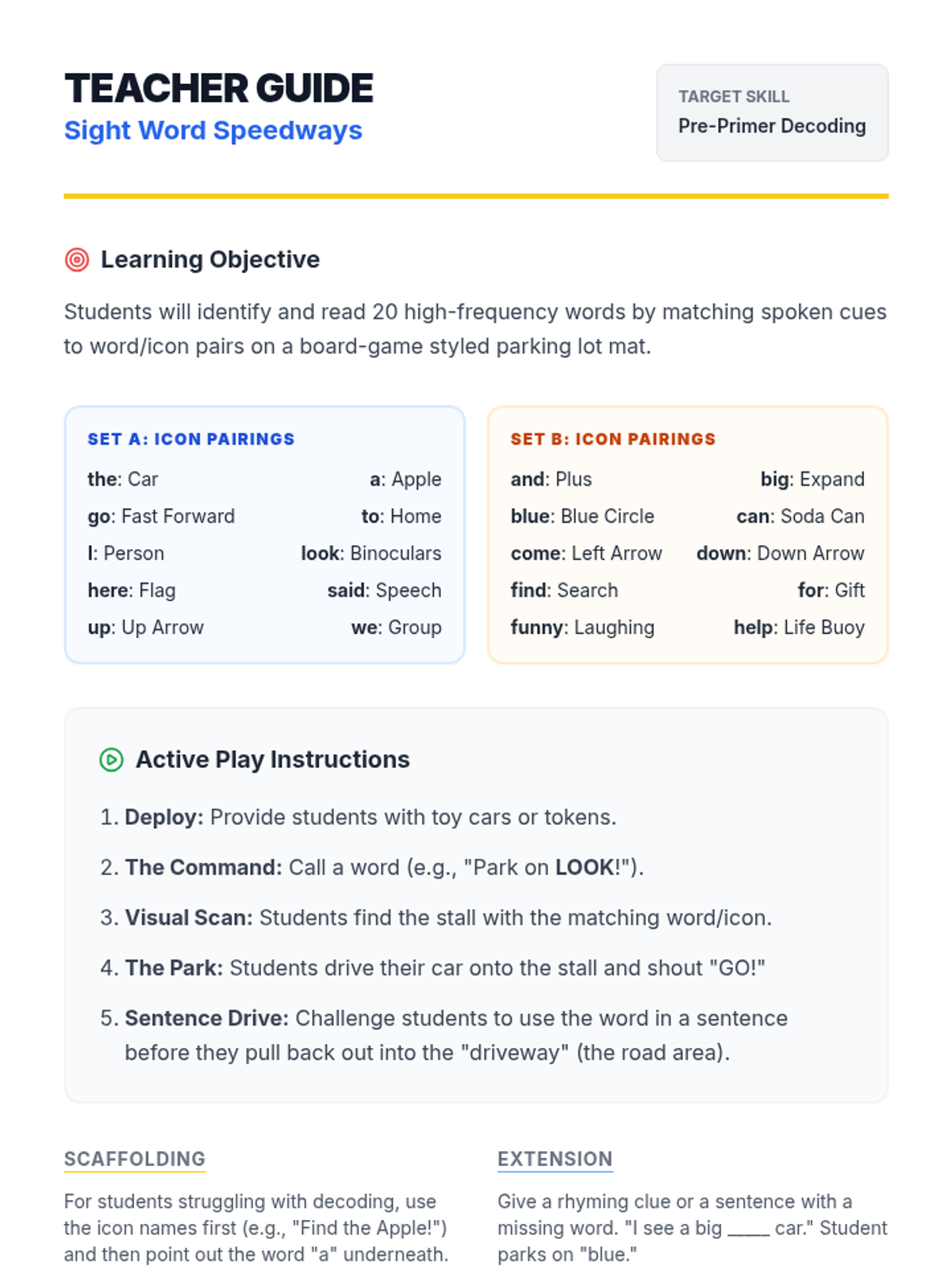 Updated teacher guide for the revised Sight Word Speedway mats. Features word/icon pairing charts for Sets A and B, plus active play strategies and scaffolding tips.