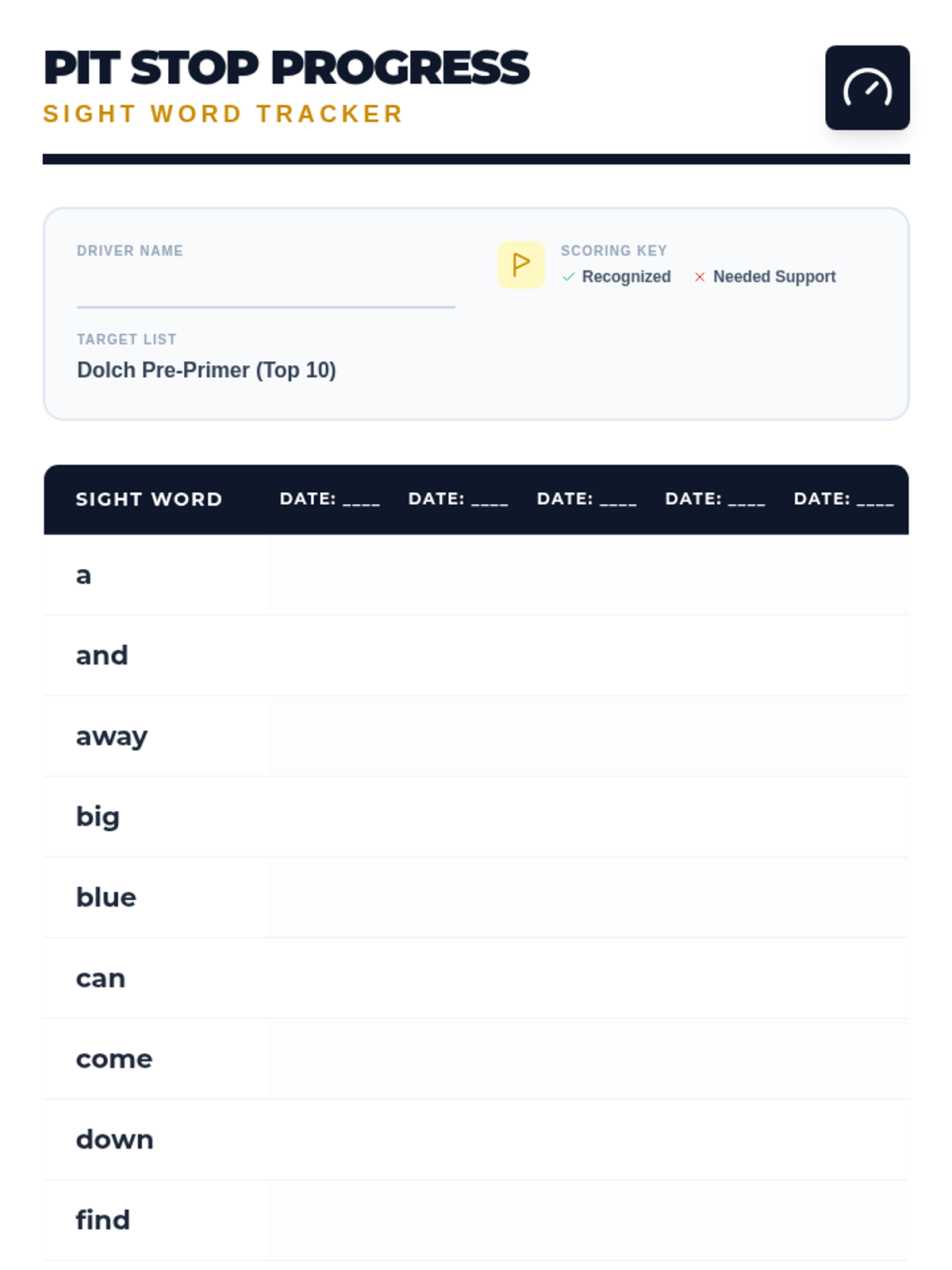 A professional progress tracker for monitoring sight word mastery across five sessions, designed with a clean racing-inspired theme for easy data collection.
