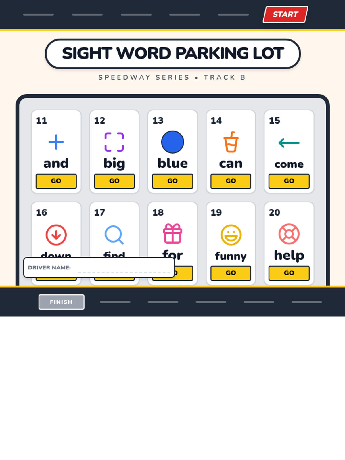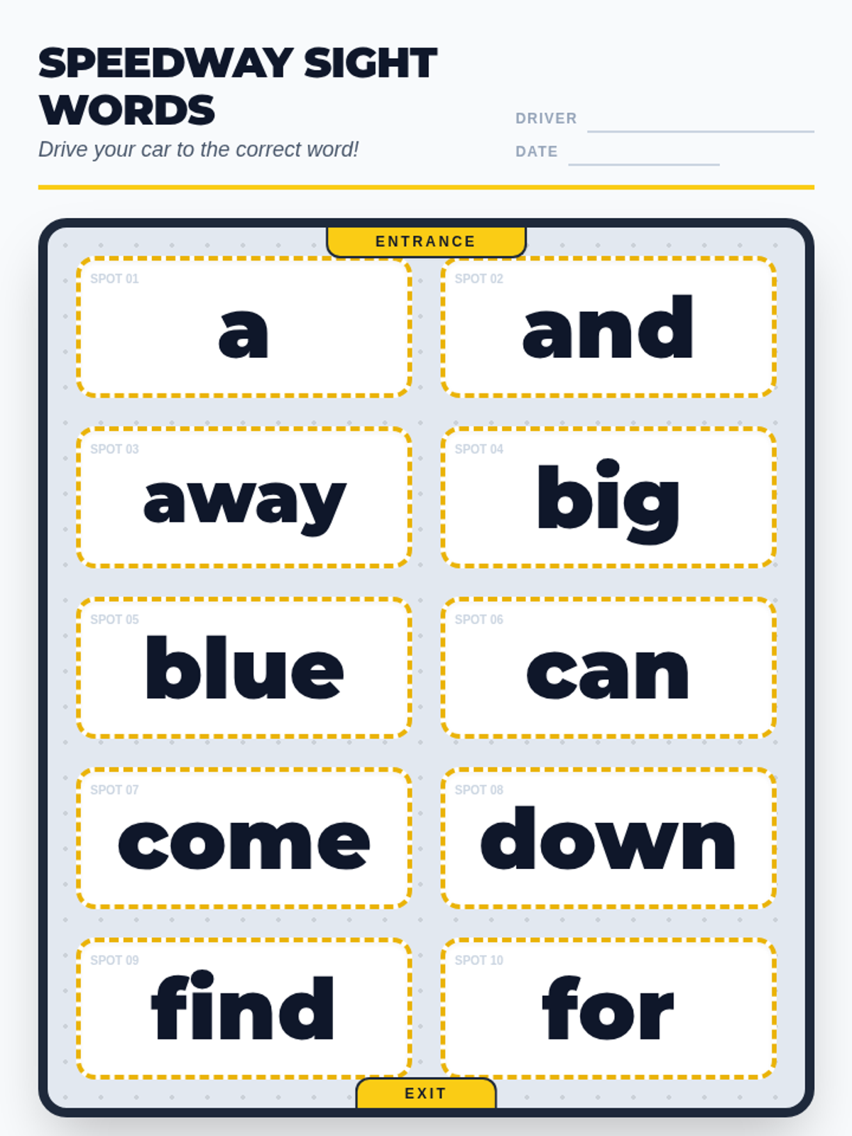 A high-energy parking lot themed mat for sight word practice, featuring the top 10 Dolch Pre-Primer words in a clean, high-contrast grid designed for tactile car play.
