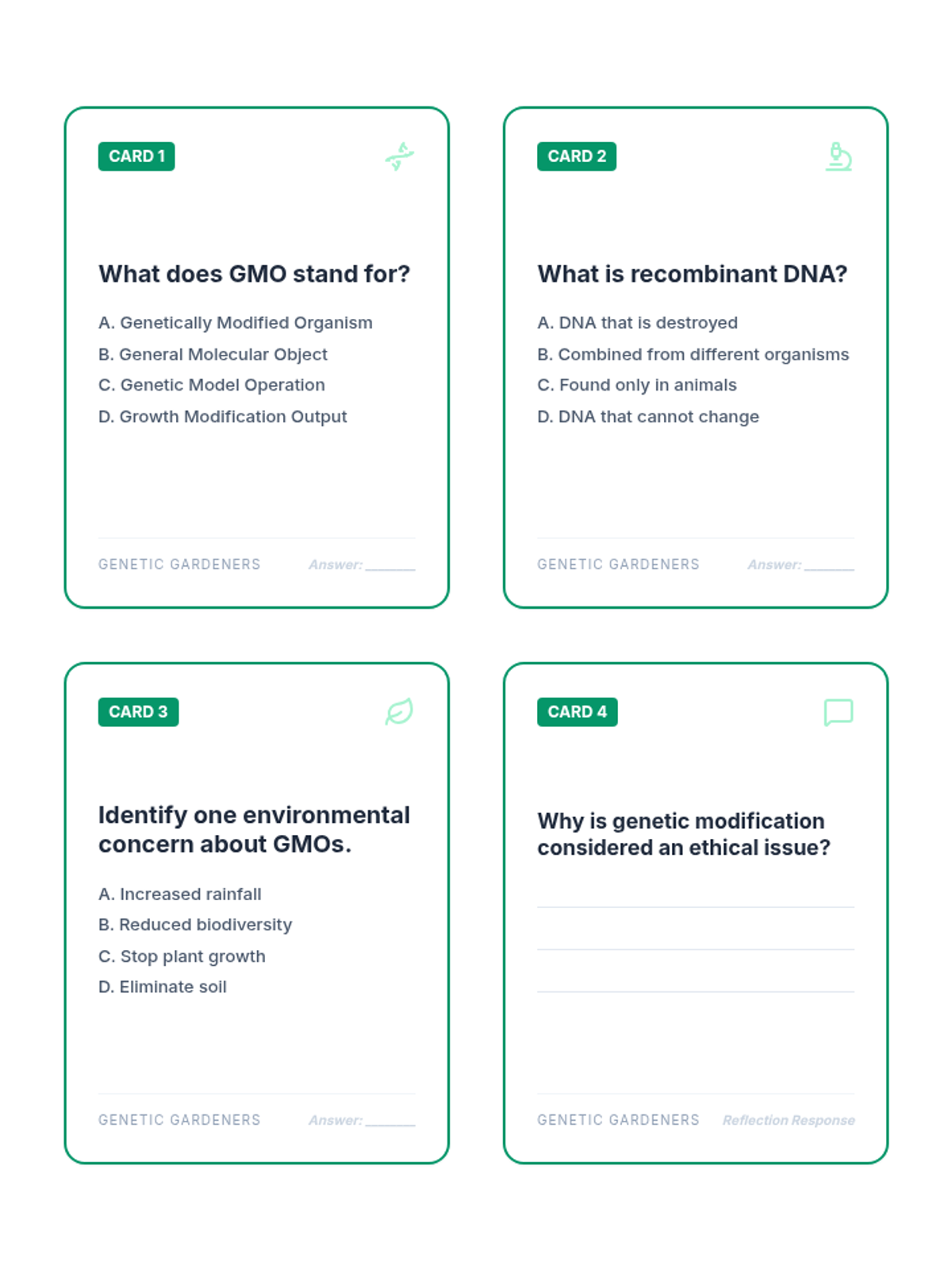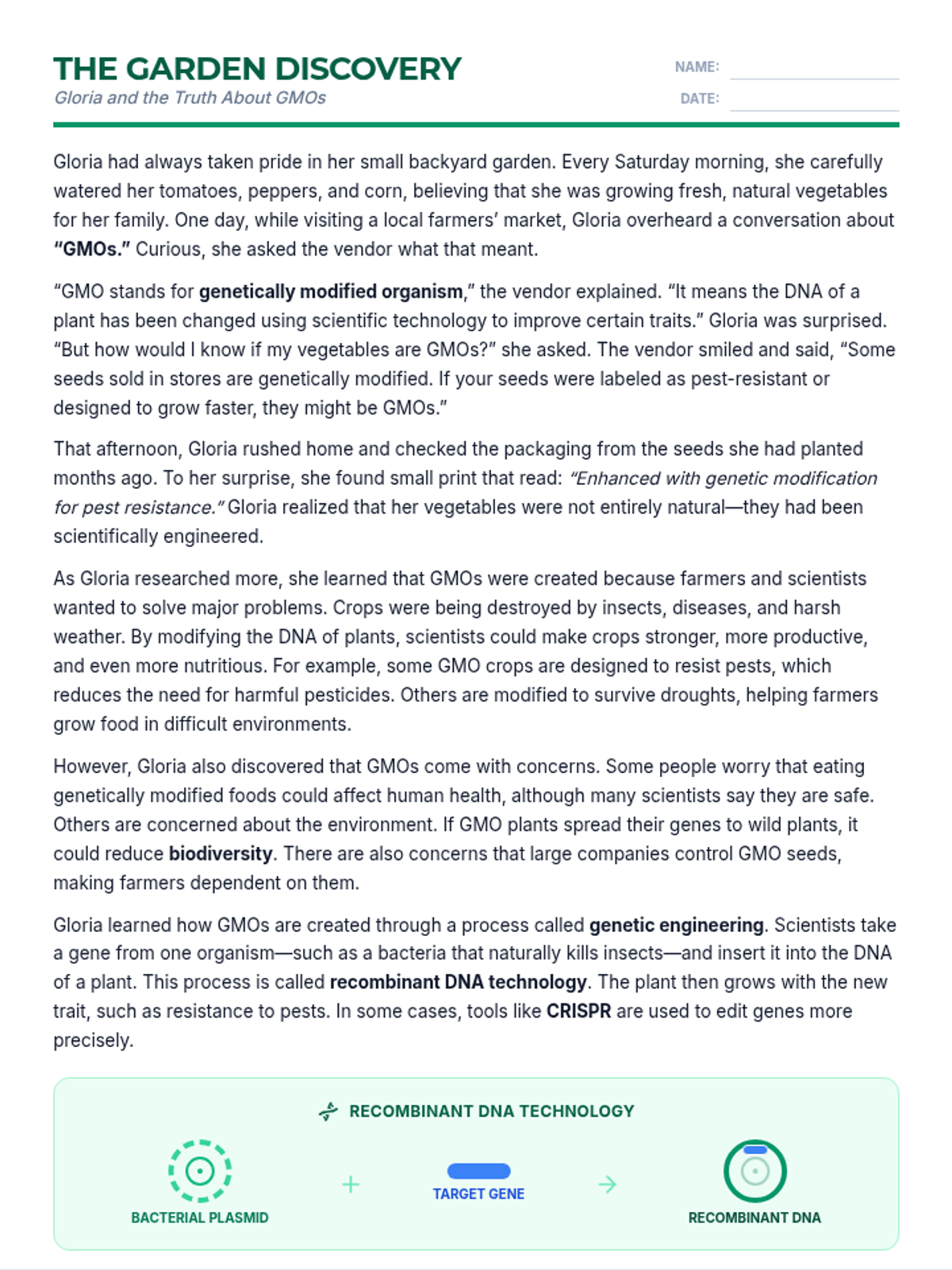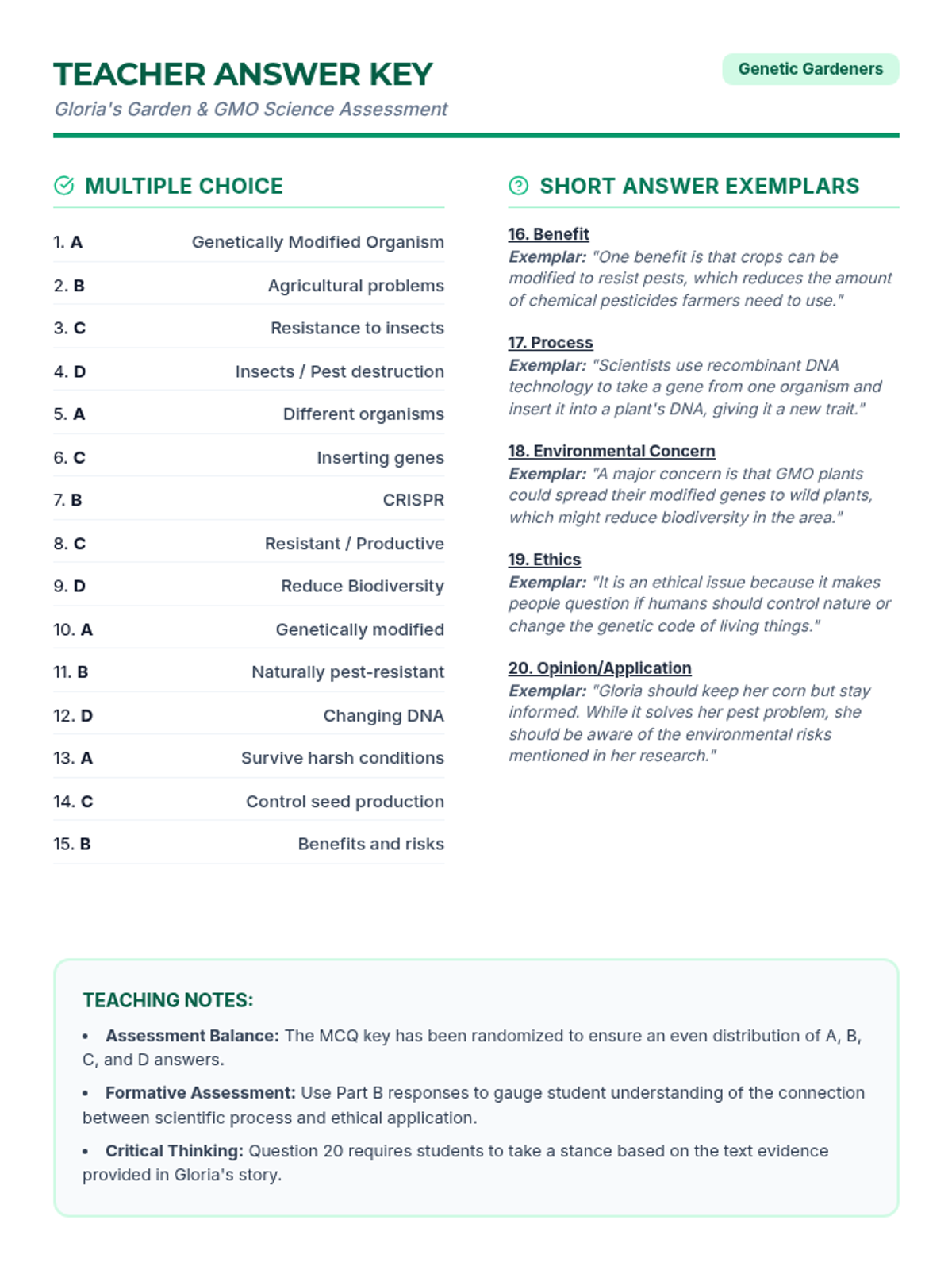 A finalized student worksheet with randomized multiple-choice answer positions to ensure assessment validity. Features scientific diagrams, the Gloria's Garden story, and reflection questions.