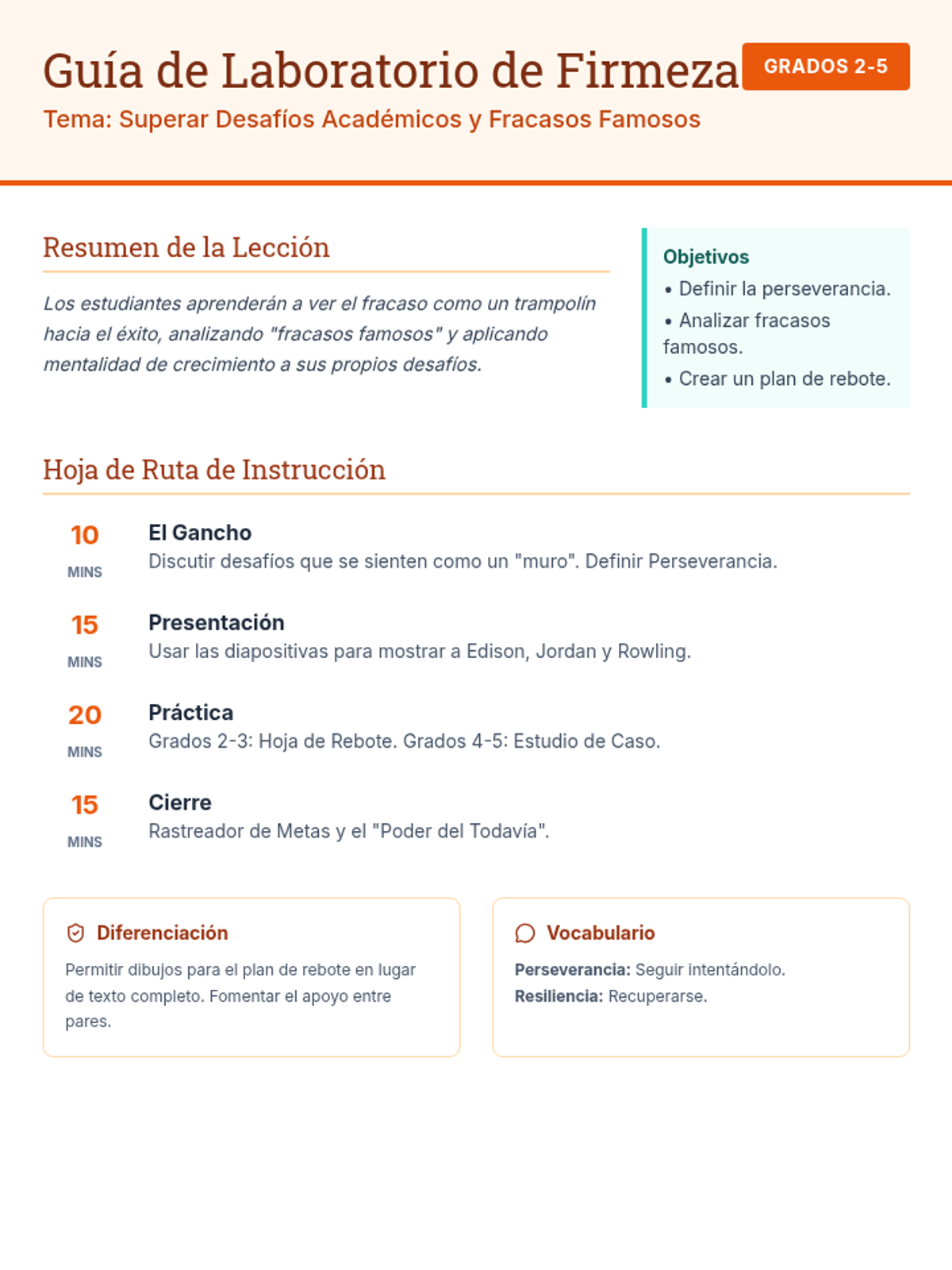 Spanish language teacher guide for a lesson on perseverance, featuring pacing, objectives, and instructional strategies for Grades 2-5. Revised for better page breaks and layout.