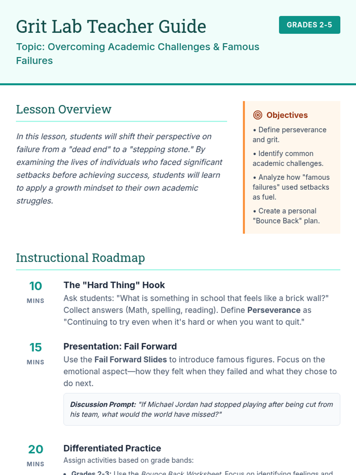 Teacher guide for a lesson on perseverance, featuring pacing, objectives, and instructional strategies for Grades 2-5. Revised for better page breaks and layout.